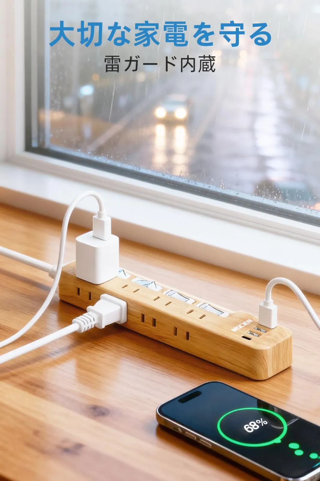 【安心】耐熱性に優れた材質が付いており、雷ガードを内蔵しており、雷サージによる家電への被害防止に役立ちます