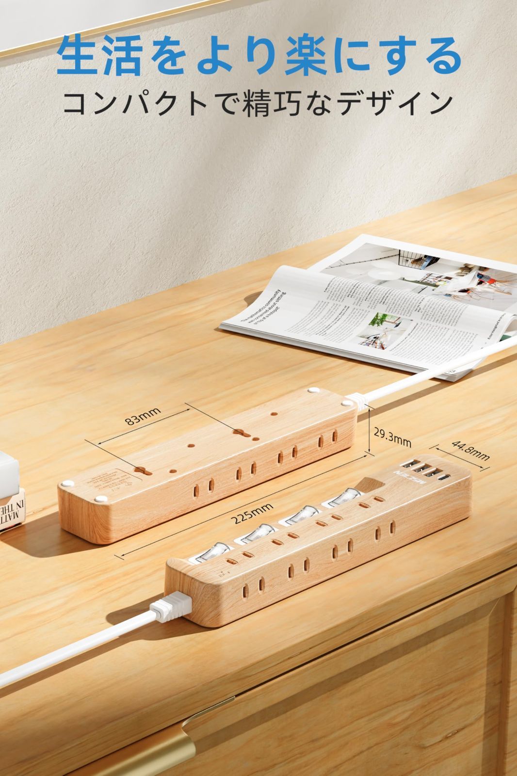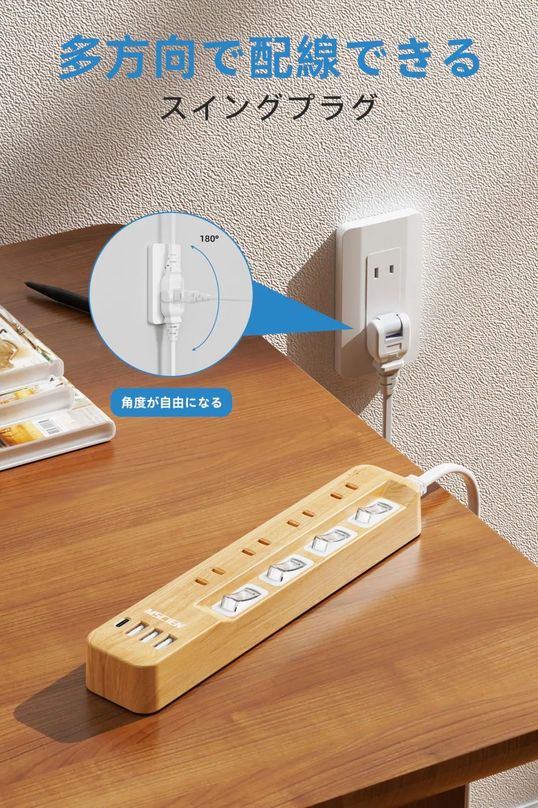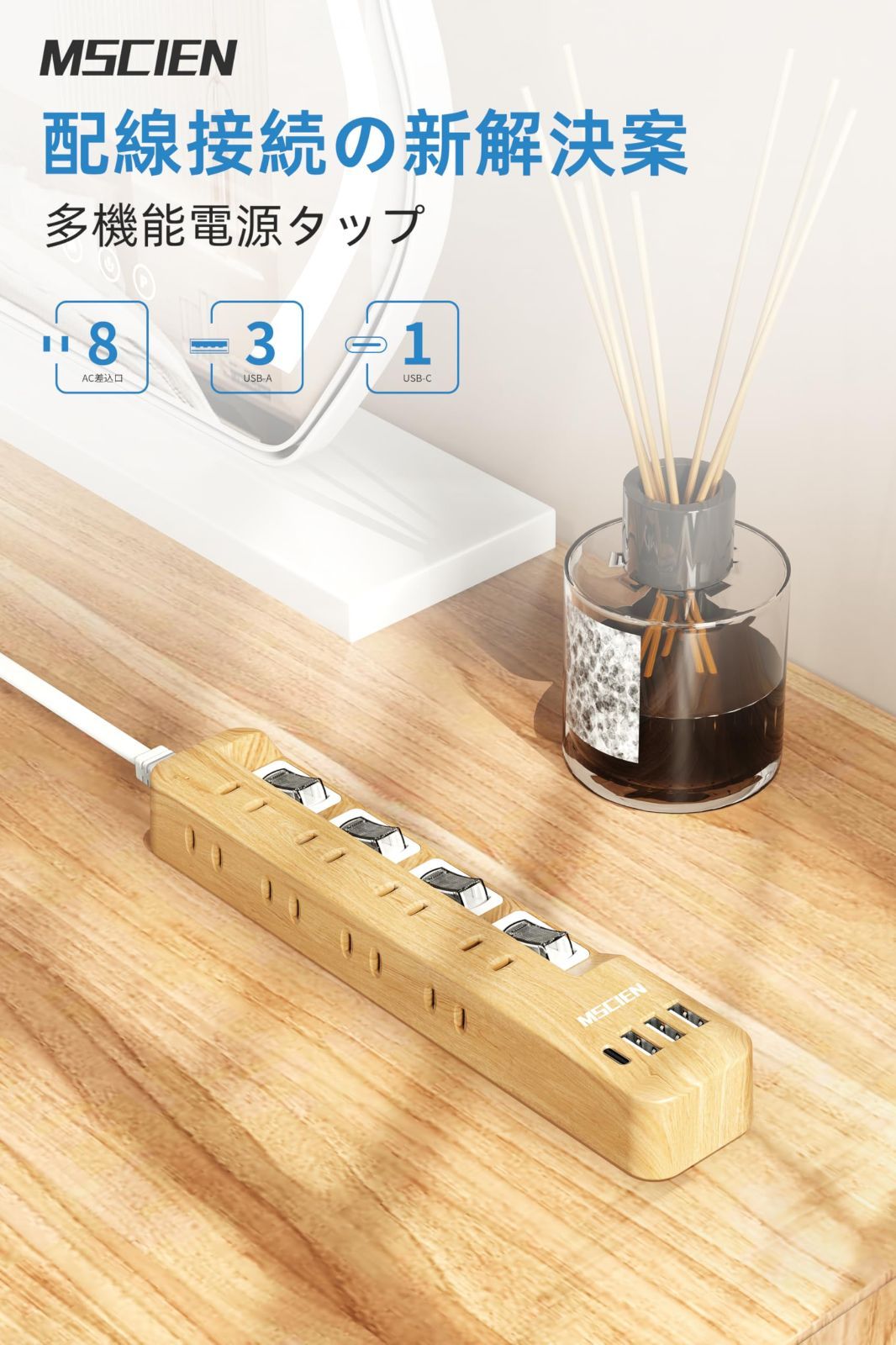 Mscien 延長コード 1m 木目 8AC口 3usb-a 1usb-c 雷ガード 個別スイッチ 電源タップ usb付き マルチタップ たこあしコンセント 分岐 oa テーブルタップ スイングプラグ 壁掛け 木目調 蛸足コンセント エムサイン