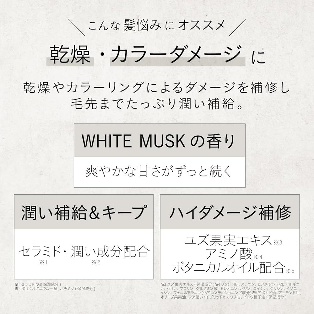 ●シャンプーの後、軽く水気を取り、適量を毛先から全体に馴染ませ数分置いた後、よくすすいでください。スペシャルケアとして週2~3回のご使用をおすすめします。特に傷んだ髪にはトリートメント後にご使用いただくことをおすすめします。 「主な仕様」乾燥やカラーリングによるダメージを補修し、毛先までたっぷり潤い補給。ホワイトムスクの爽やかな香りが続くヘアマスク 1種類のセラミドと2種類のうるおい成分配合で、うるおい補給&キープ。 保湿成分(ユズ果実エキス)、13種のアミノ酸、6種のボタニカルオイル配合でハイダメージ補修 ホワイトムスクの奥深く透明感あふれる印象はしっかりと残しながらアップルとペアが奏でる優しいフルーティーノートから始まり、ほのかに香るグリーンのエッセンスが爽やかな印象を運びます。次第に透明感あふれるピーチの瑞々しい甘さをホワイトフローラルの奥深い華やかさが包み込み、落ち着きのある凛とした印象を与えます 髪や地肌にやさしい、無着色・無鉱物油・パラベンフリー・アルコールフリー・弱酸性処方 内容量:200g
