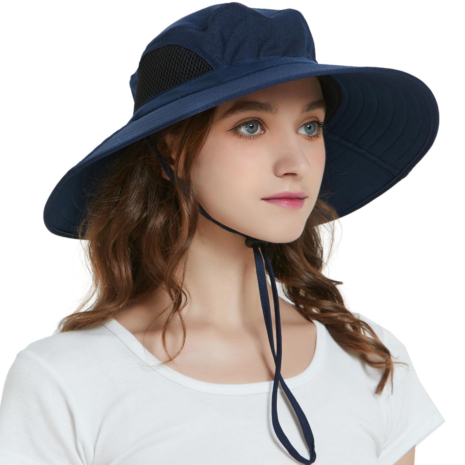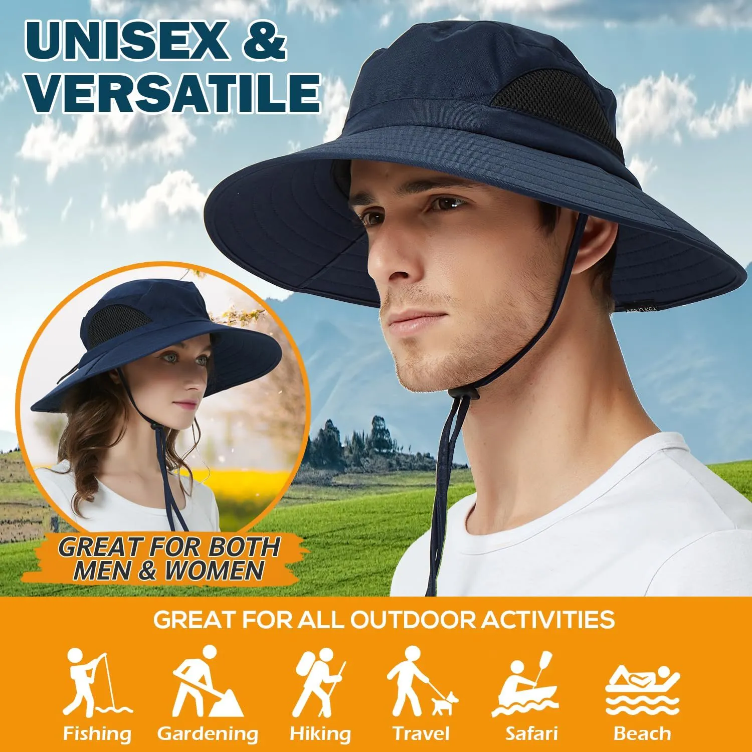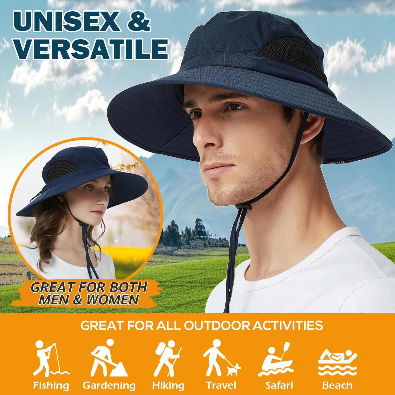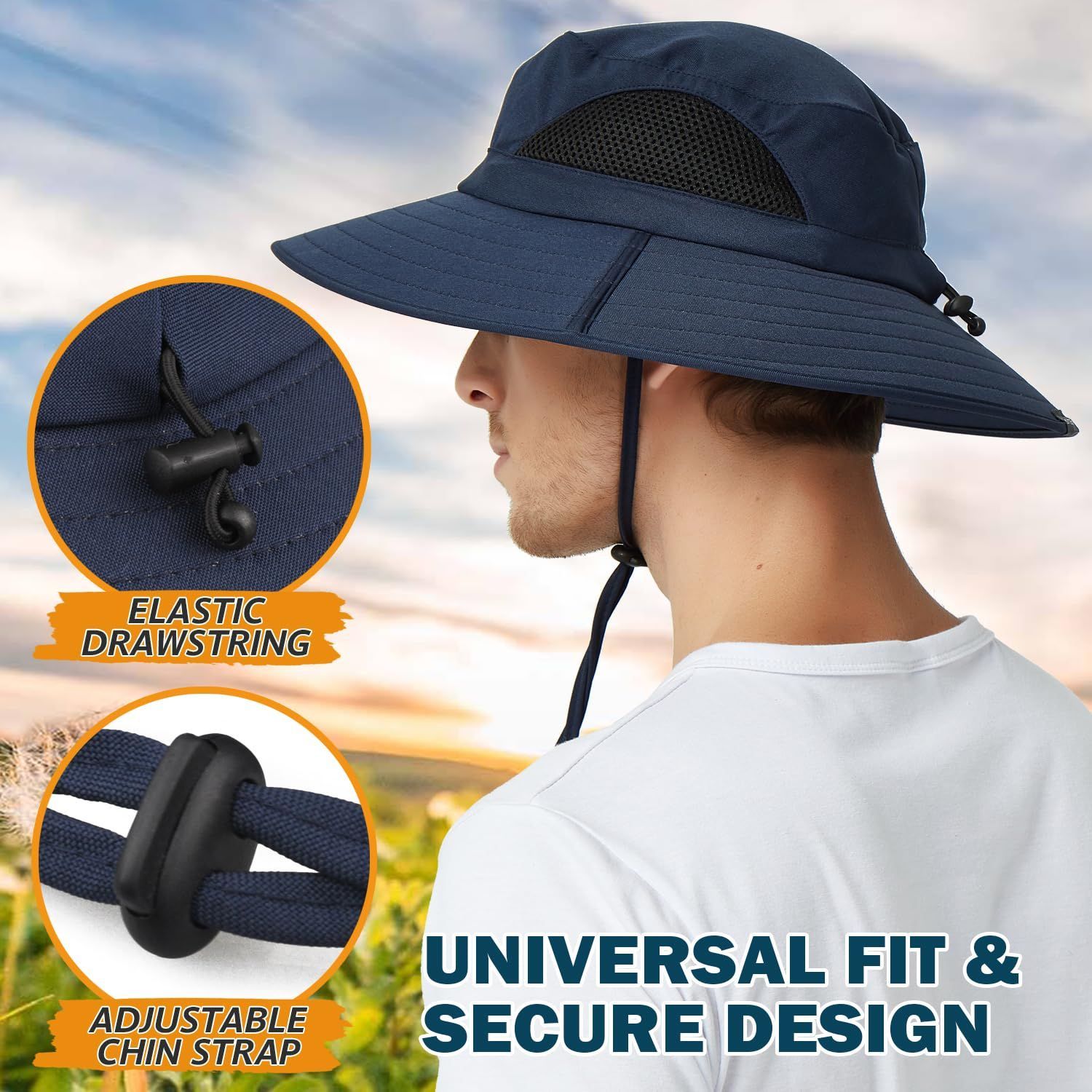 【可調整&男女兼用】後部の伸縮性ひも設計により、頭のサイズに合わせて54-60cmに調整可能です。可調整な顎紐で帽子が風で吹き飛ばされないようにします。男性と女性に適しています 。 ?