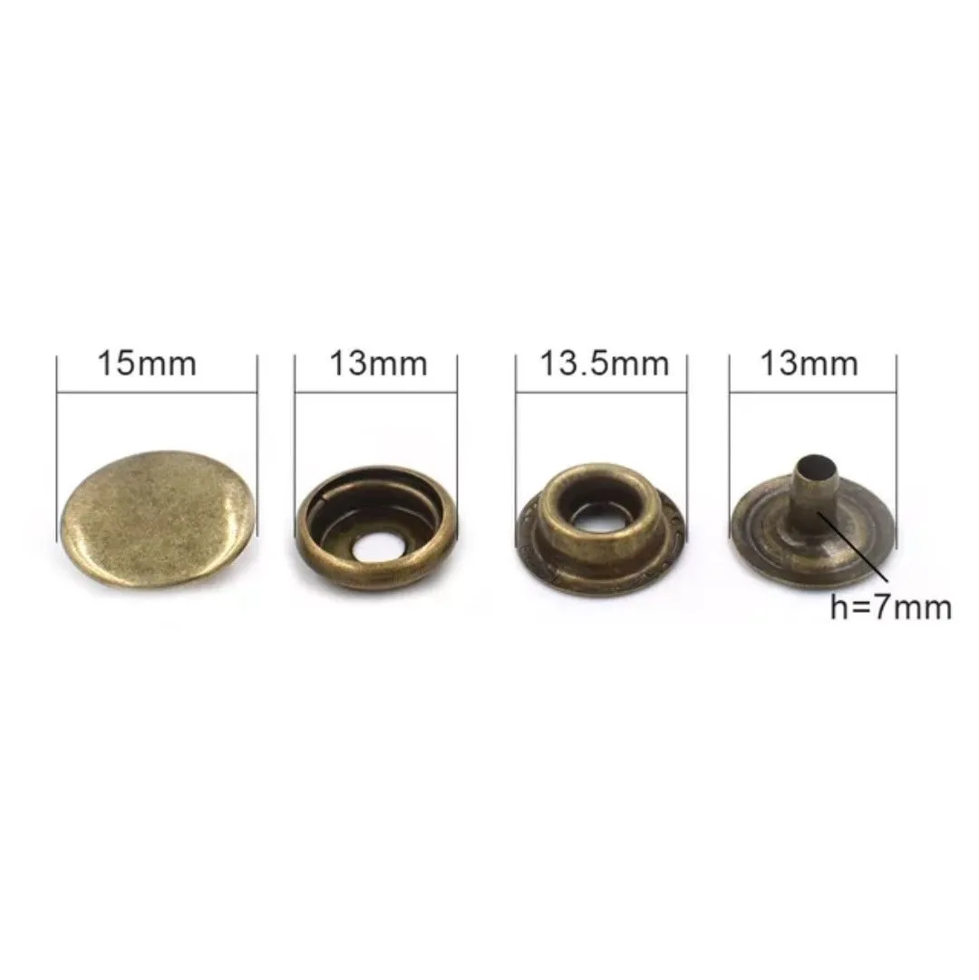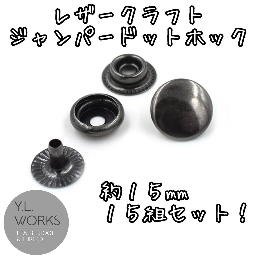 レザークラフトやハンドメイド、服飾リメイクなどにお使いいただけるジャンパーホック15組セットです。