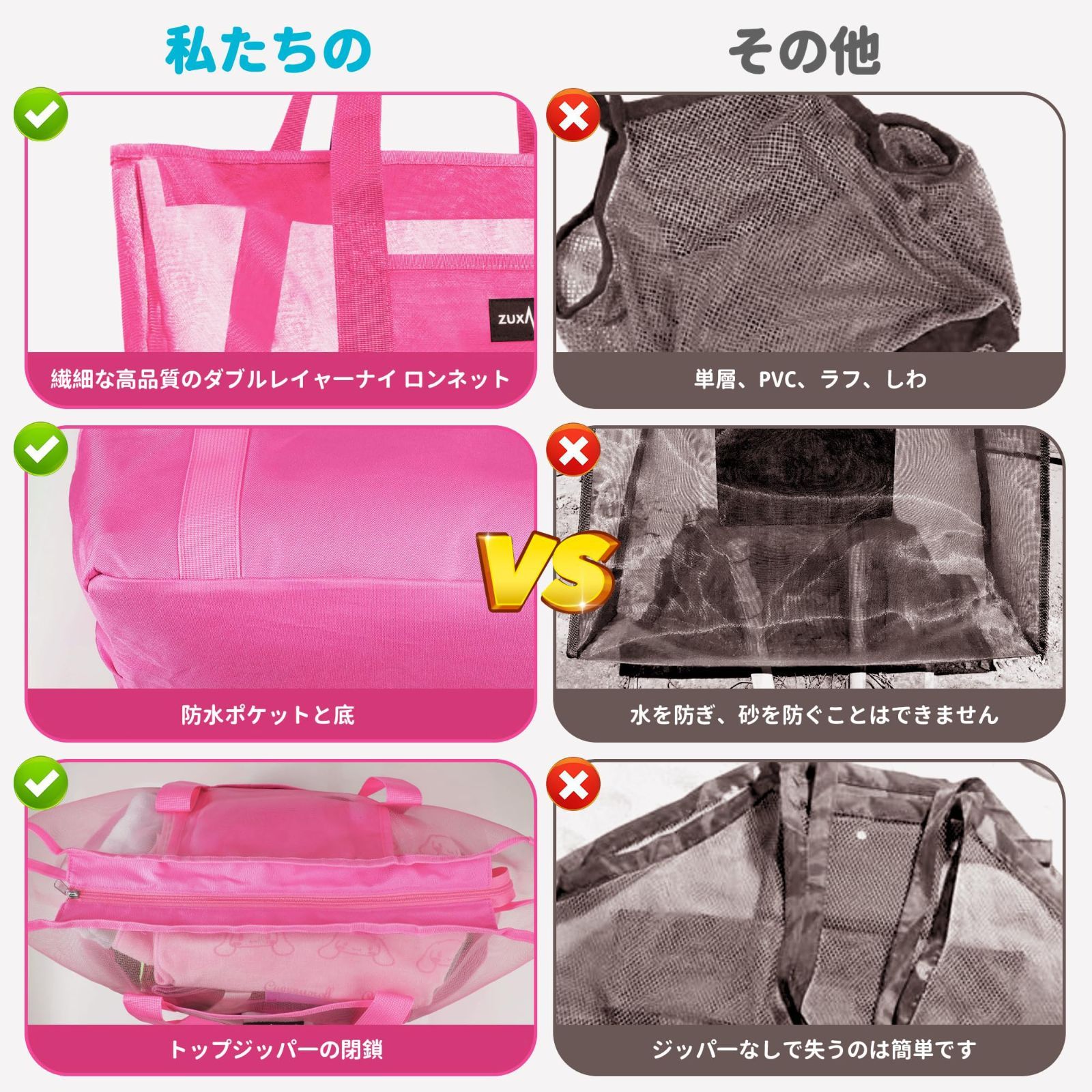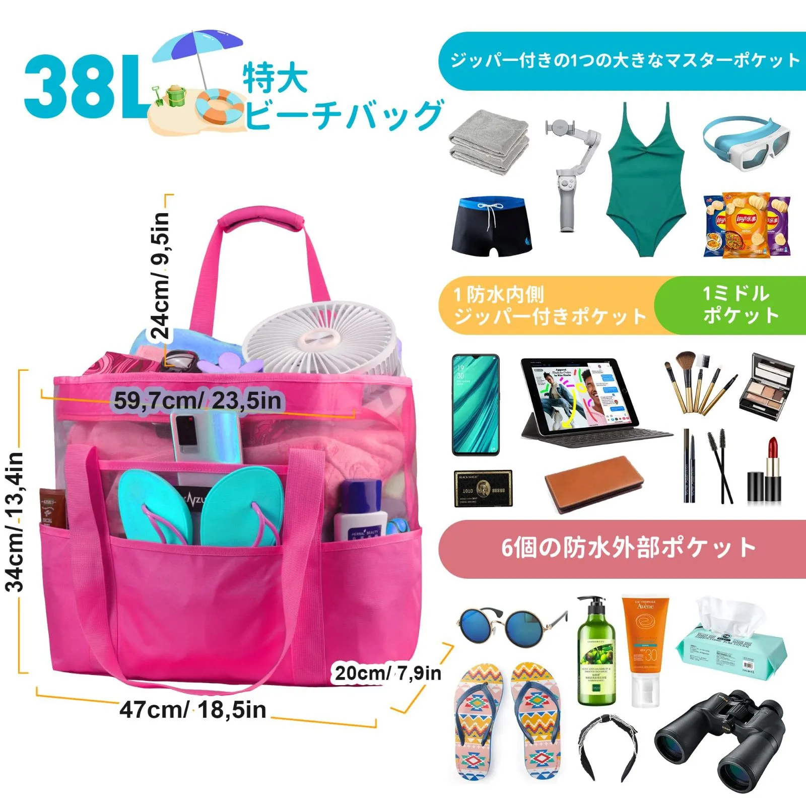 [ZUXNZUX] ビーチバッグ プールバッグ 軽量 38L 大容量 防水 折り畳み可能 メッシュバッグ ビーチ/ショッピング/水泳/ジム/スパ/温泉/旅行用 バッグ
