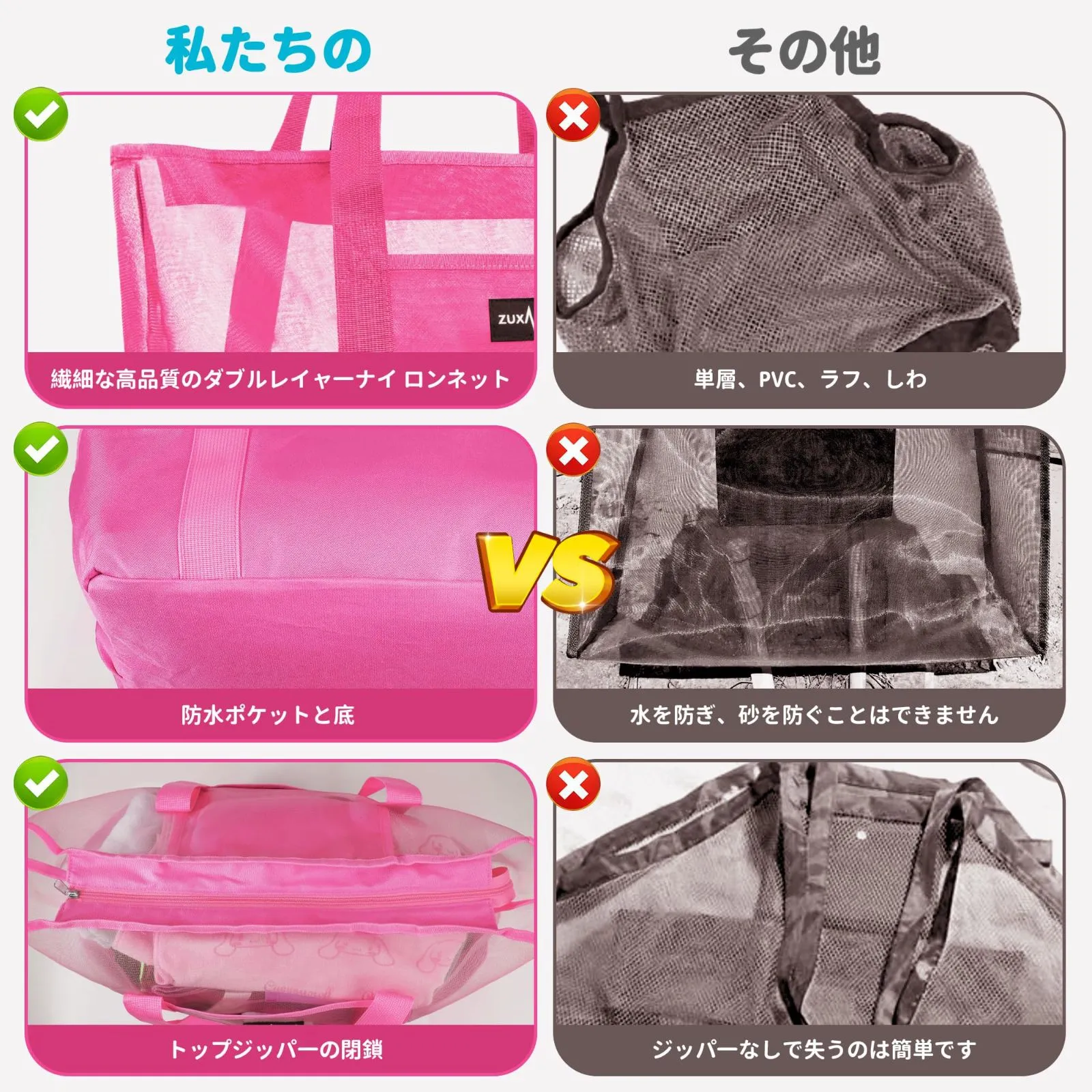 【商品仕様】2枚重ねの細かいメッシュのデザインが特徴のビーチバッグです。他の PVC トートバッグとは異なり、当社のバッグは耐久性のあるナイロン層と柔らかく肌に優しいポリエステル層を備えており、どちらも優れた通気性を提供し、湿気やかび臭を防ぎます。上部のジッパーと極小メッシュの穴で砂の侵入を防ぎ、買い物かごの中の湿ったタオルの通気性を保ちます。