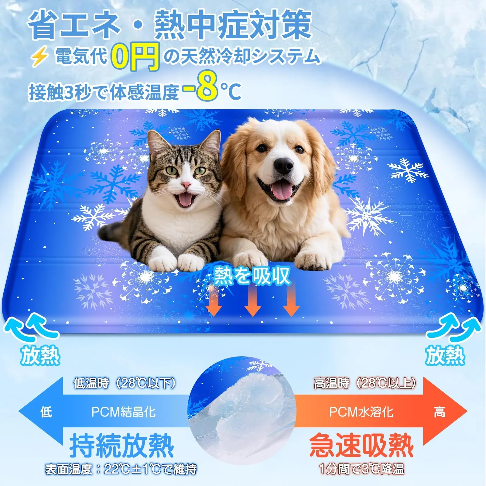 【省エネ&熱中症対策】熱伝導性の高い冷感素材を使用したペット用冷却マットはペットの体温を素早く吸収して効率よく放熱するので、電気を使用せずに触れるだけで、自然な涼感をもたらし、熱中症対策になるうえに、省エネにもなります。 ?