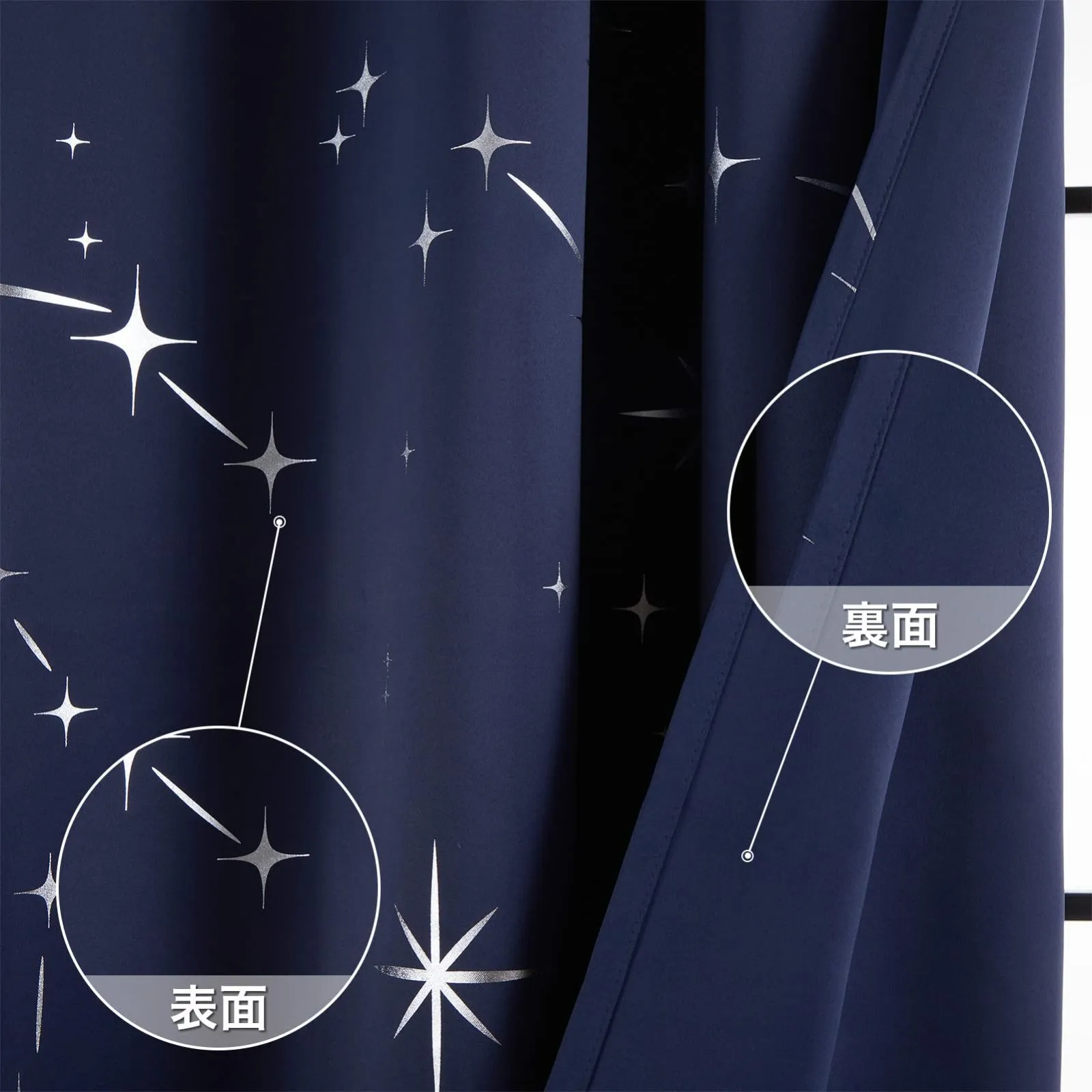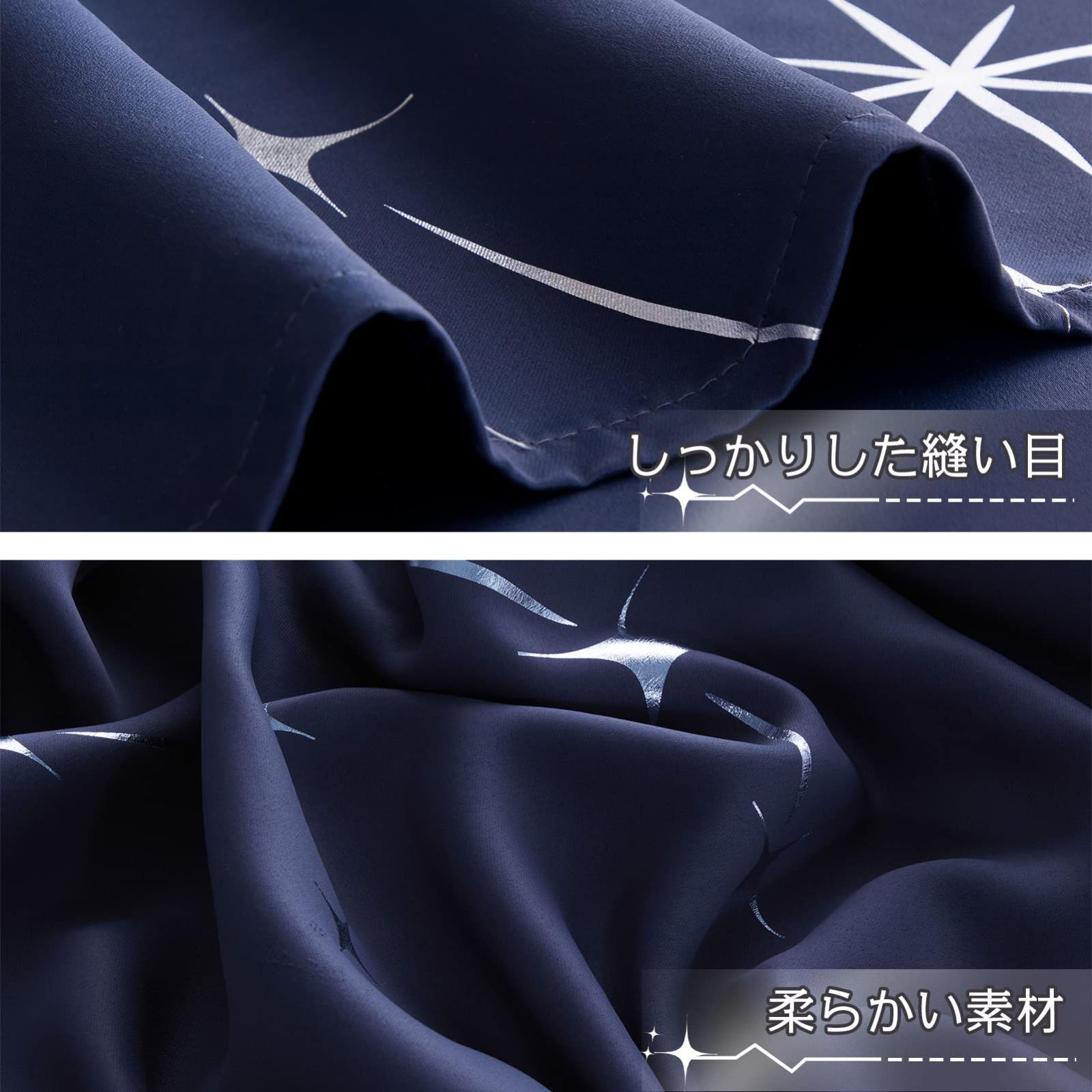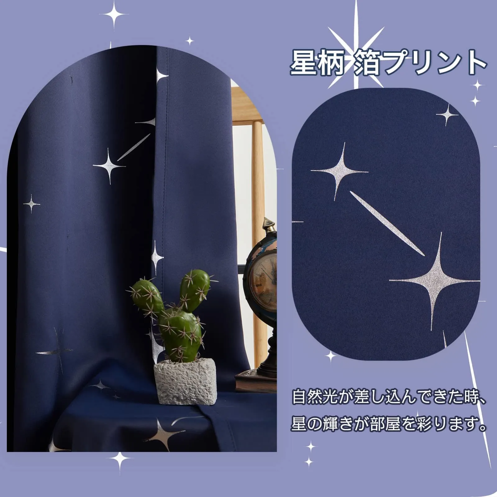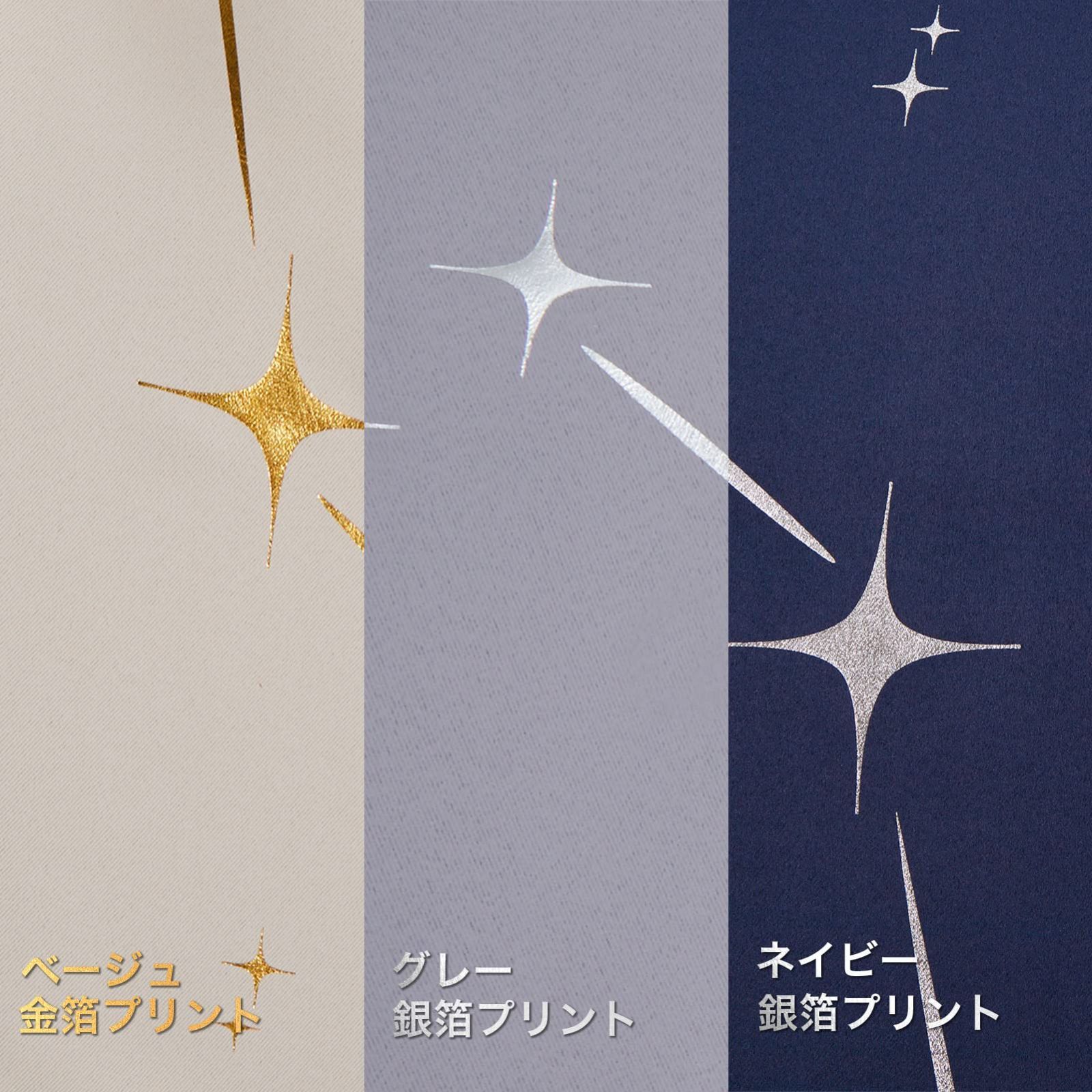 【デザイン】:箔プリントで星柄が綺麗なカーテン。光の当たり具合により箔プリントがキラキラ光って見えます。シンプルでユニークなデザインは、退屈することなく、いつでも楽しむことができます。