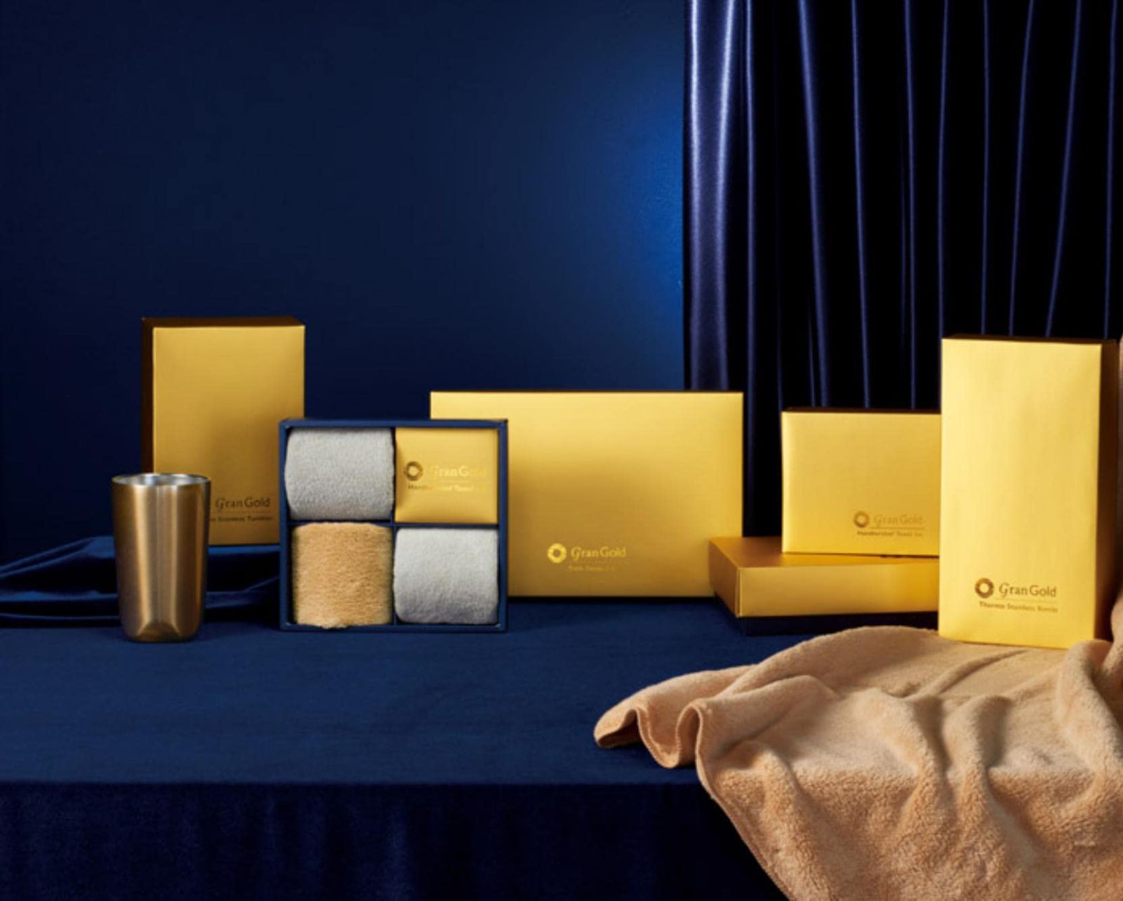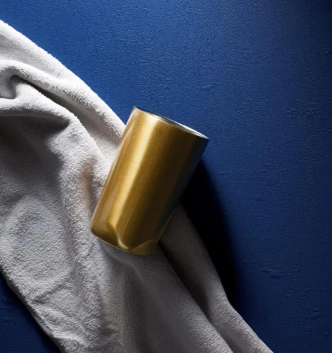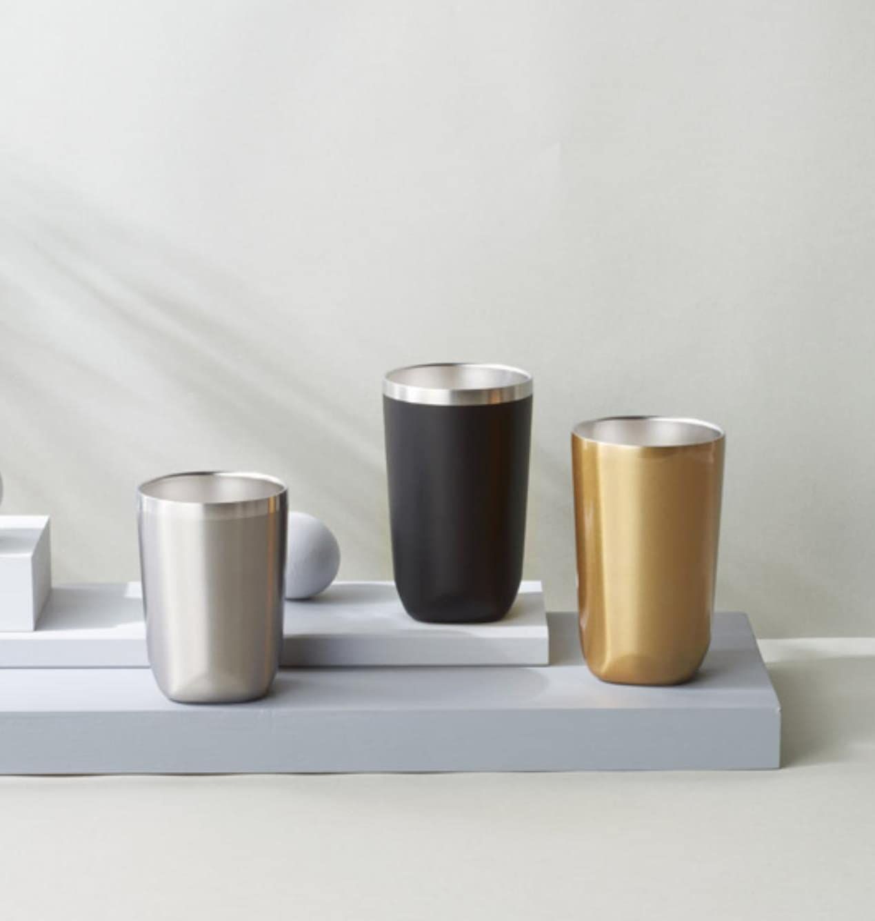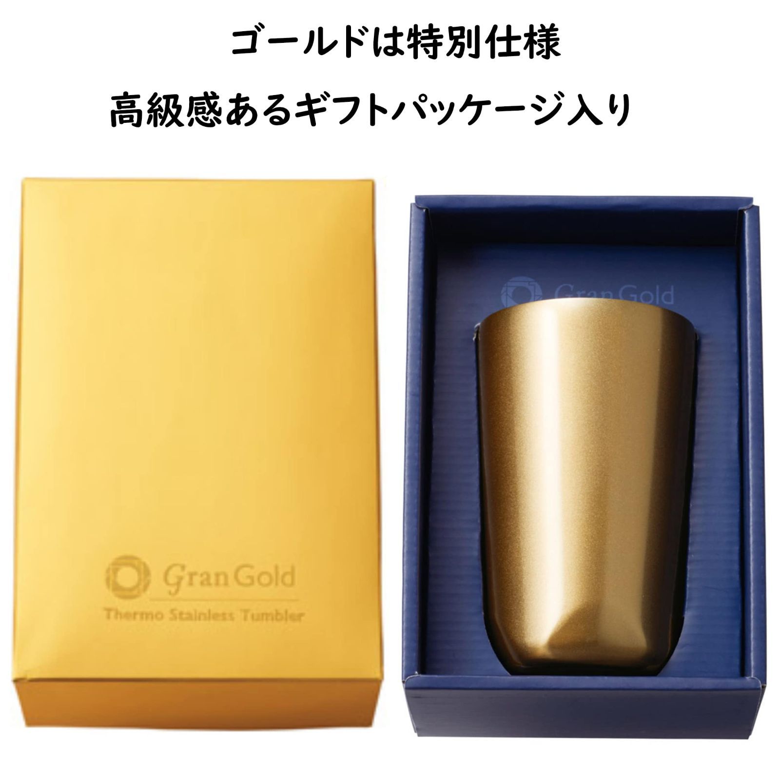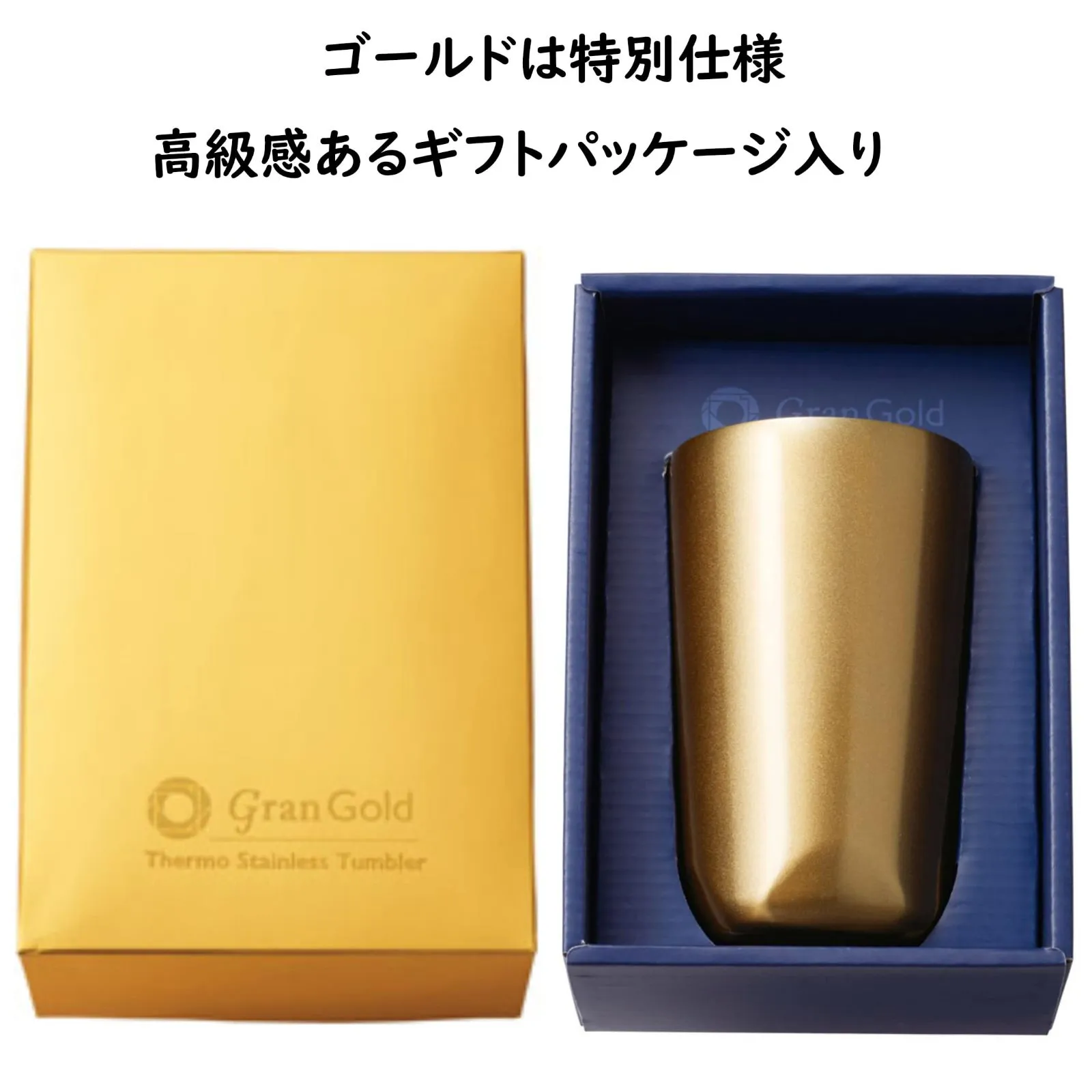 煌めくゴールド箱入りのギフト商品。積み上げるだけで注目度高まるディスプレイに。特別感ある塗装が魅力的な真空断熱タンブラー。