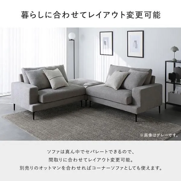 ■暮らしに合わせてレイアウト変更可能 ソファは真ん中でセパレートできるので、間取りに合わせてレイアウト変更可能。 別売りのオットマンを合わせればコーナーソファとしても使えます。