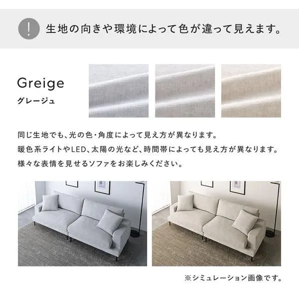 ■生地の向きや環境によって色が違って見えます。 同じ生地でも、光の色・角度によって見え方が異なります。 暖色系ライトやLED、太陽の光など、時間帯によっても見え方が異なります。 様々な表情を見せるソファをお楽しみください。