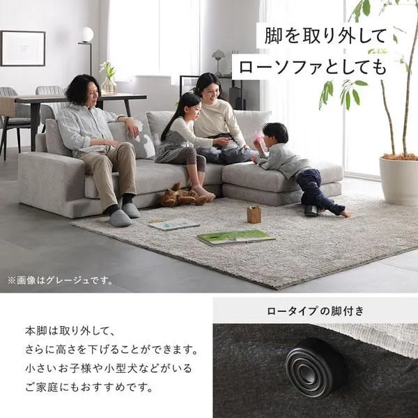 ■脚を取り外してローソファとしても 本脚は取り外して、さらに高さを下げることができます。 小さいお子様や小型犬などがいるご家庭にもおすすめです。 ・ロータイプの脚付き