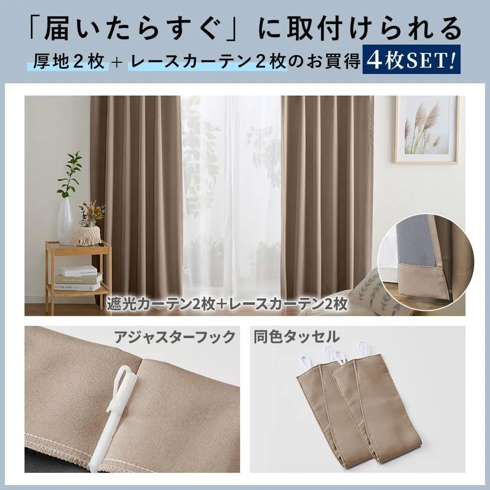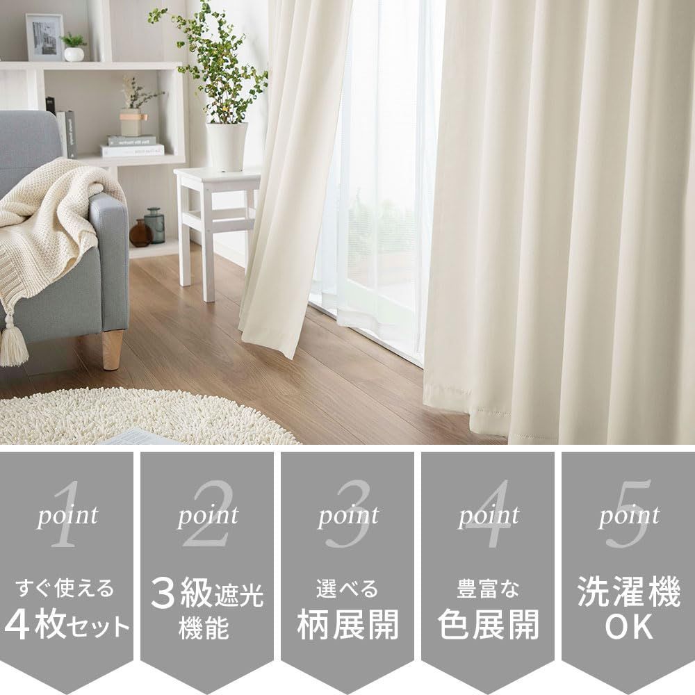 ベルーナ(BELLUNA) カーテン 4枚セット 遮光 おしゃれ 遮光カーテン 4枚組 幅100 幅150 幅200 無地 柄 タッセル付 アジャスターフック付き 北欧 シンプル 洗える 新生活 一人暮らし 引っ越し (555814-804)