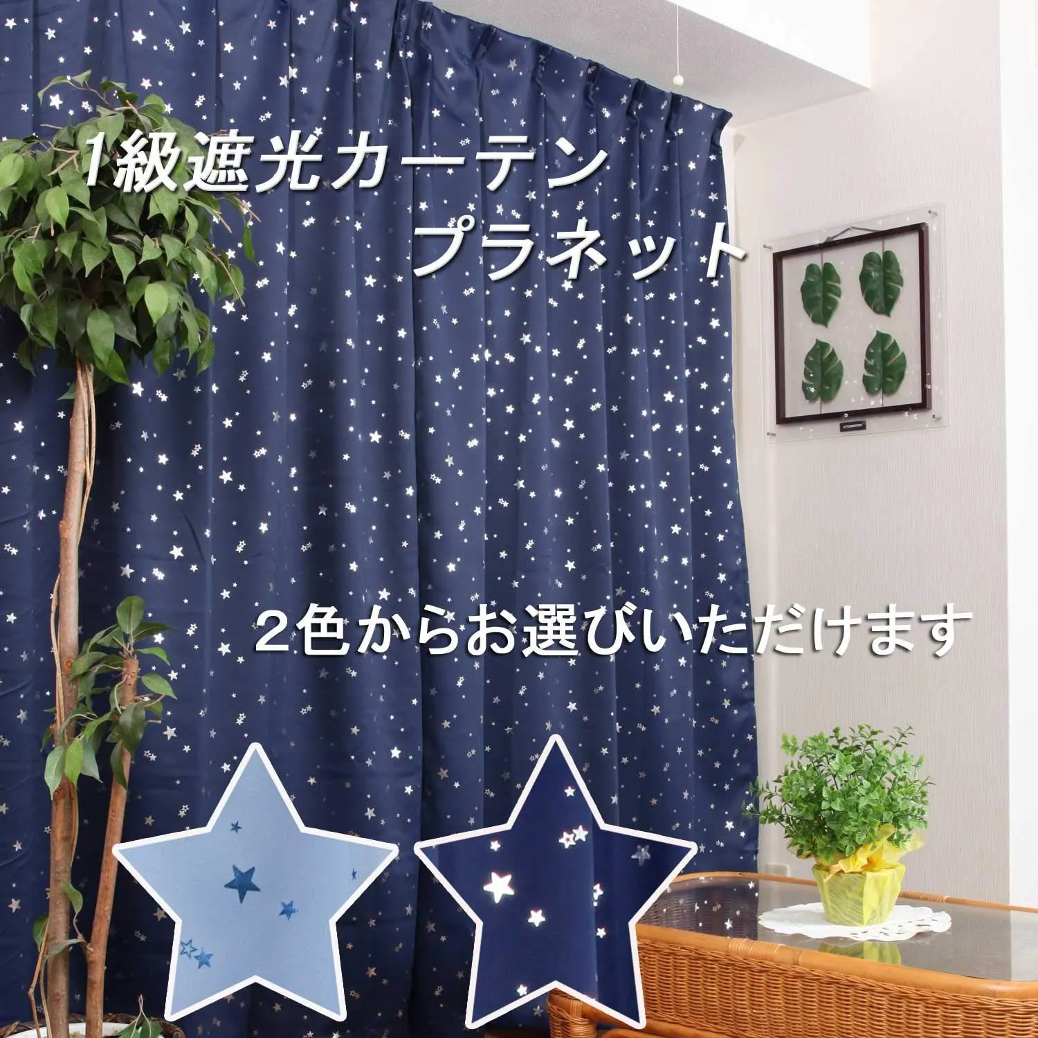 ライトブルー プラネット 星柄 幅100cm×丈135cm 箔プリント 2枚入 断熱 1級遮光 8サイズ カーテン