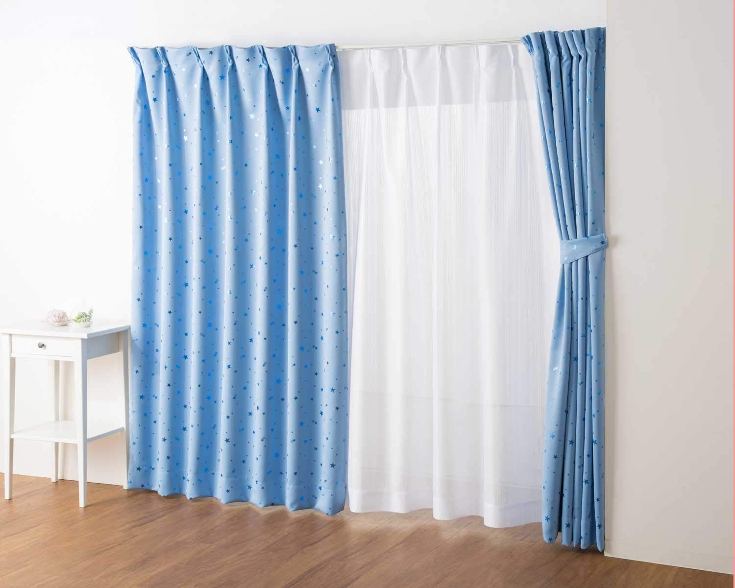 【サイズ/カラー】 幅100cm×丈135cm 2枚入/ライトブルー x 星柄(箔プリント)ブルー