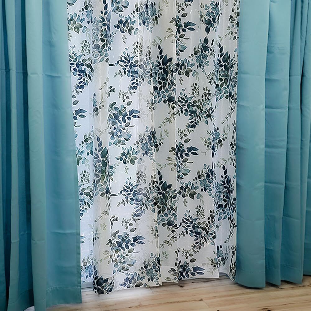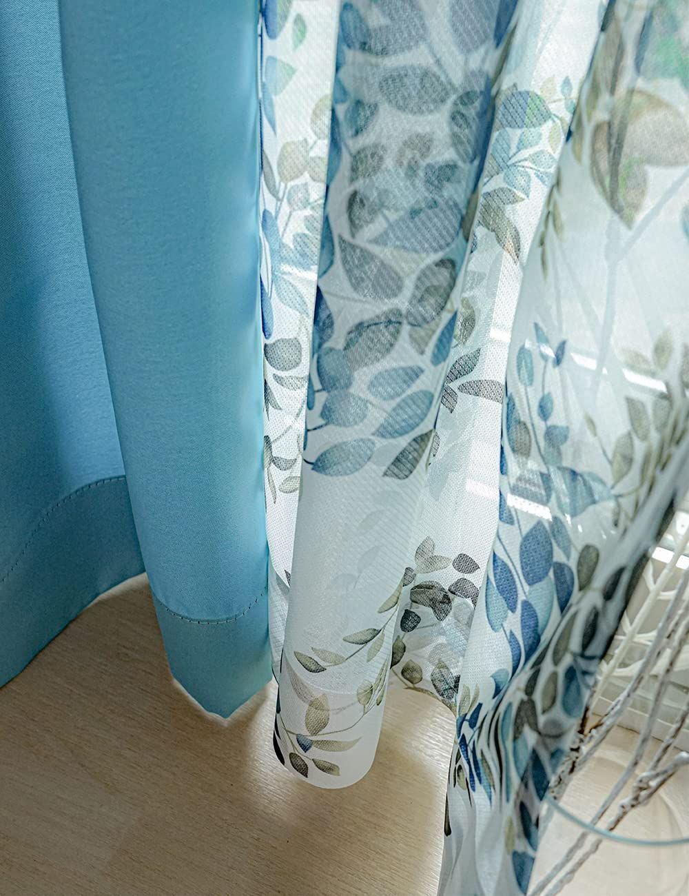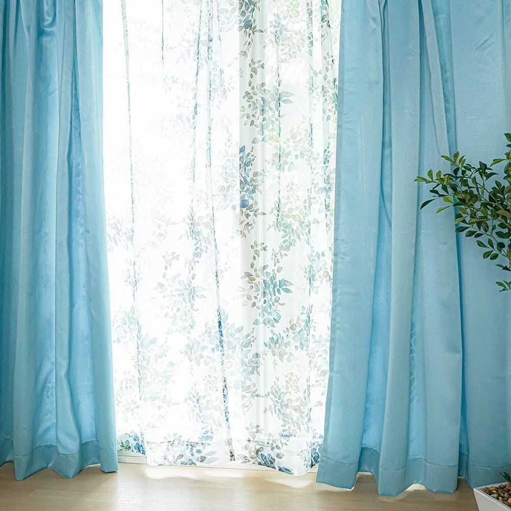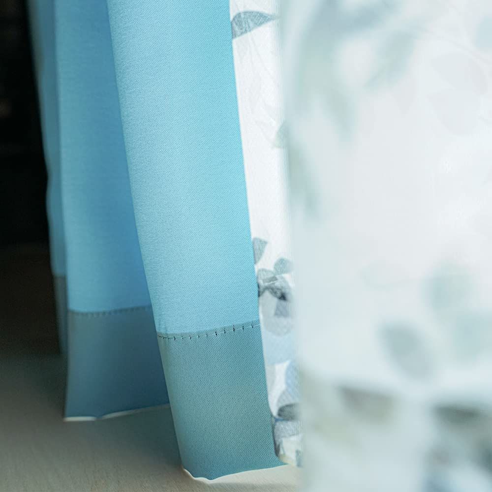 遮光カーテン 2枚 + 花柄 デザイン レース 2枚 + カーテンフック取り付け済み + カーテンタッセル ブルー 幅100×丈105(103)cm 4枚セット 4枚組 カーテンセット