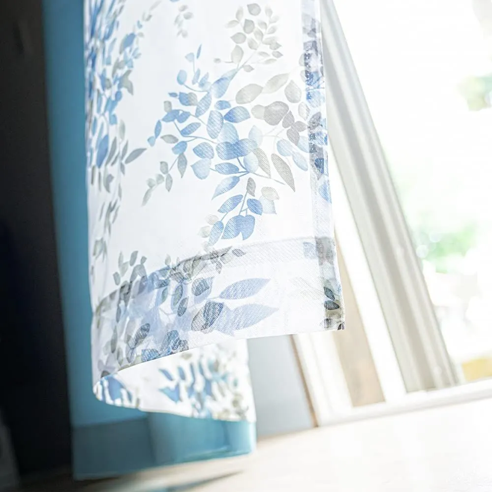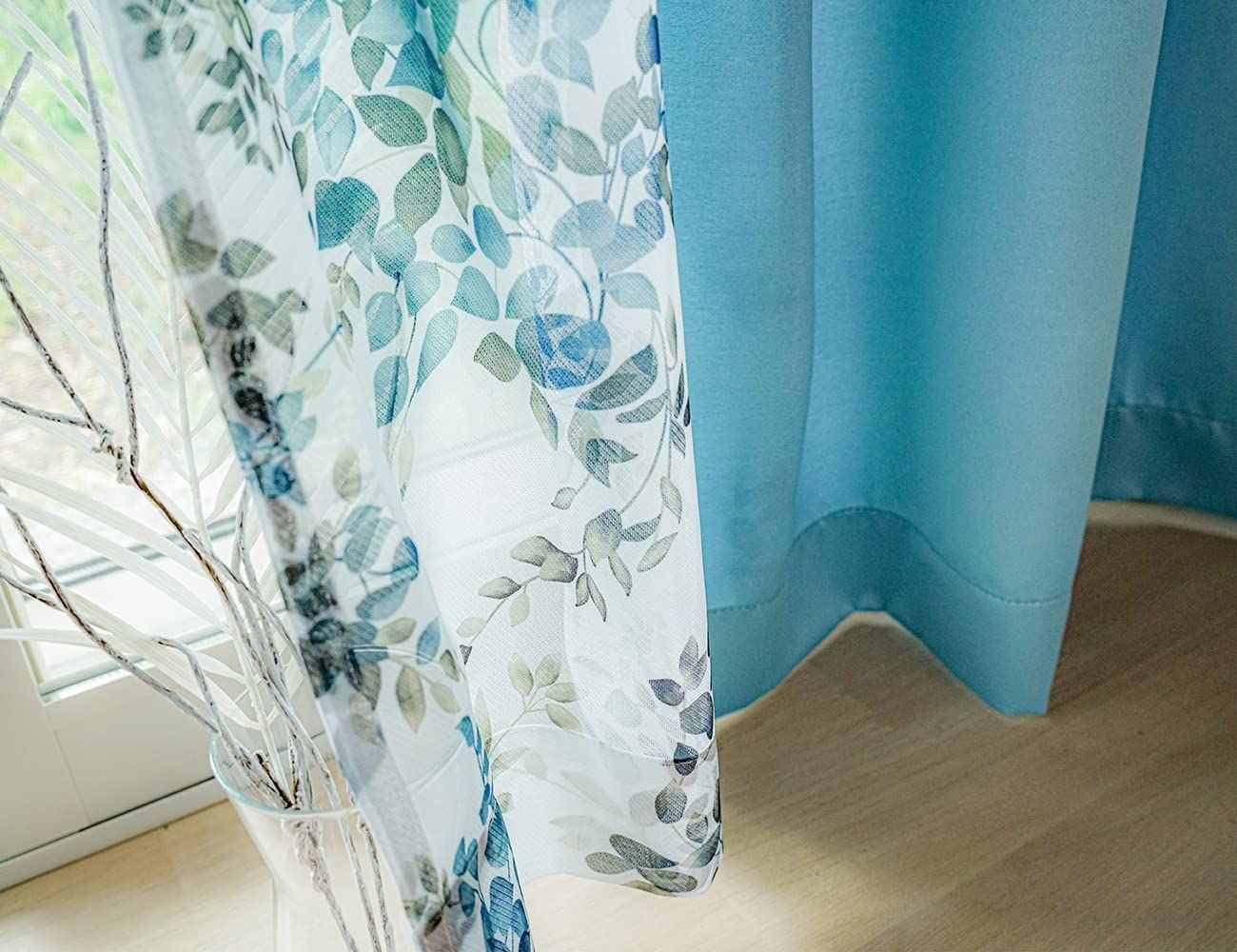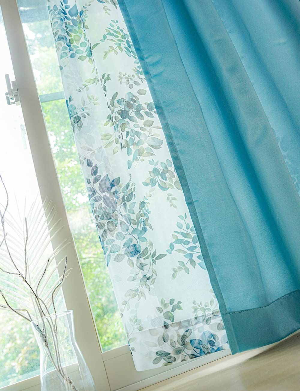 遮光カーテン 2枚 + 花柄 デザイン レース 2枚 + カーテンフック取り付け済み + カーテンタッセル ブルー 幅100×丈105(103)cm 4枚セット 4枚組 カーテンセット