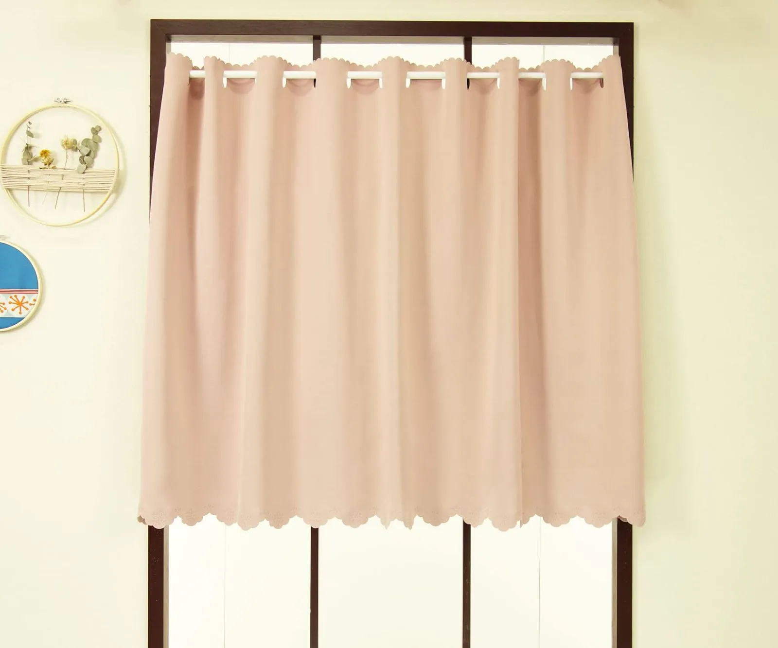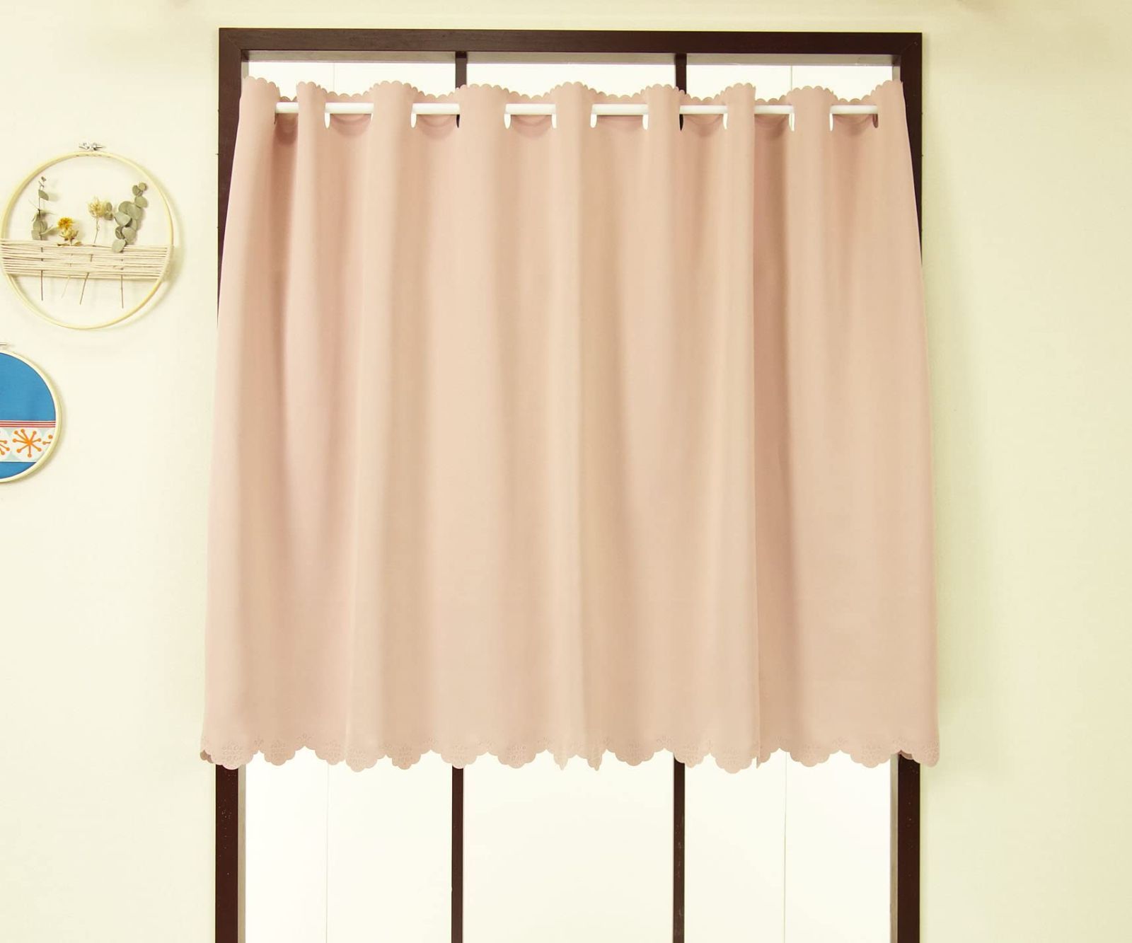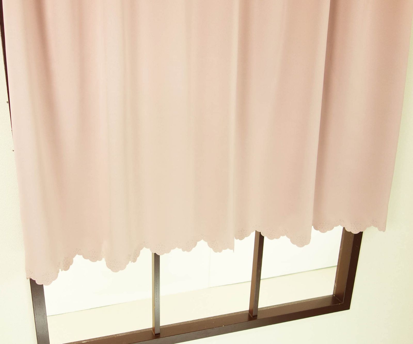 商品内容:断熱遮熱機能に優れた滑らかな触感の無地の防炎機能付きの遮光率99.99%の遮光1級カフェカーテン「ピティ」(色:クラウドピンク 柄:無地) 1枚 ※ウルトラソニックウェーブ加工で裾を深めのスカラップ状にカット、上部はロッドホールと小さなウェーブ状にカット、無地でありながらもオシャレでスッキリとシンプルな仕上がりになっています。両サイドのみミシン縫製となっており、防炎ラベル等が縫い付けられています。