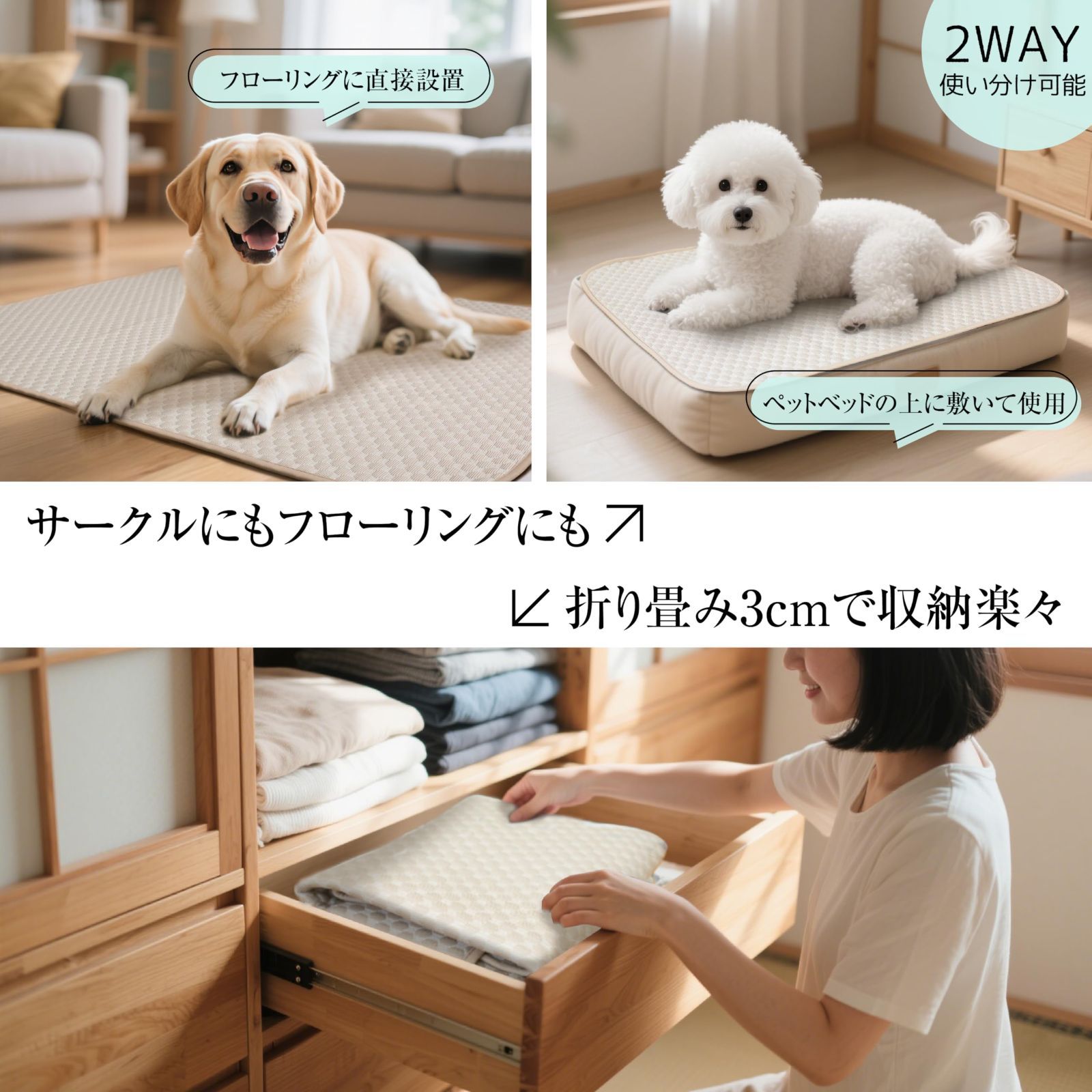 【滑り止め|通気性ダブル機能】 底面に特殊メッシュ「スリップストップメッシュ」を採用。ペットが動いてもマットがずれにくく、激しい動きにも対応。三層構造の通気性で床との密着を防ぎ、蒸れを徹底解消します。 ?