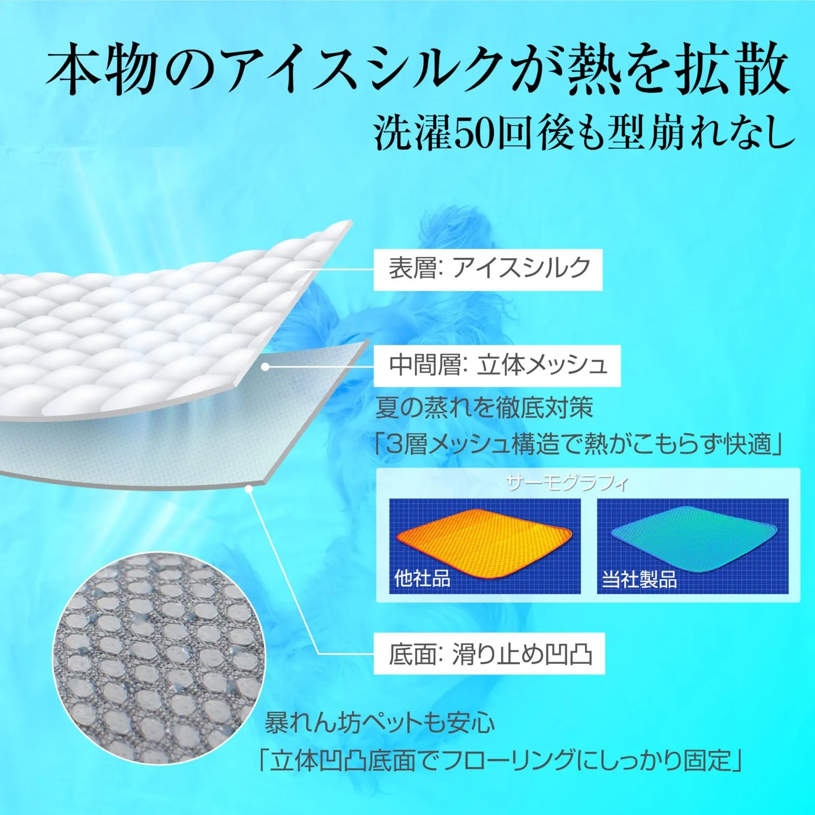 【ひんやり持続|アイスシルクの瞬間冷却】 犬猫が乗るだけで「接触冷感級」のひんやり感。高密度アイスシルク繊維が熱を拡散し、真夏の室内でも涼しい寝床をキープ。夏の暑さで疲れたペットの体温を効果的に冷却。 ?