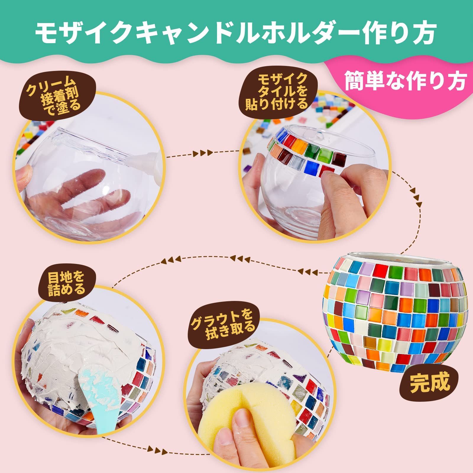 【セット内容】グラスキャンドルホルダー、モザイクタイル、スポンジ、ブラシ、ボウル、へら、日本語マニュアルなど。