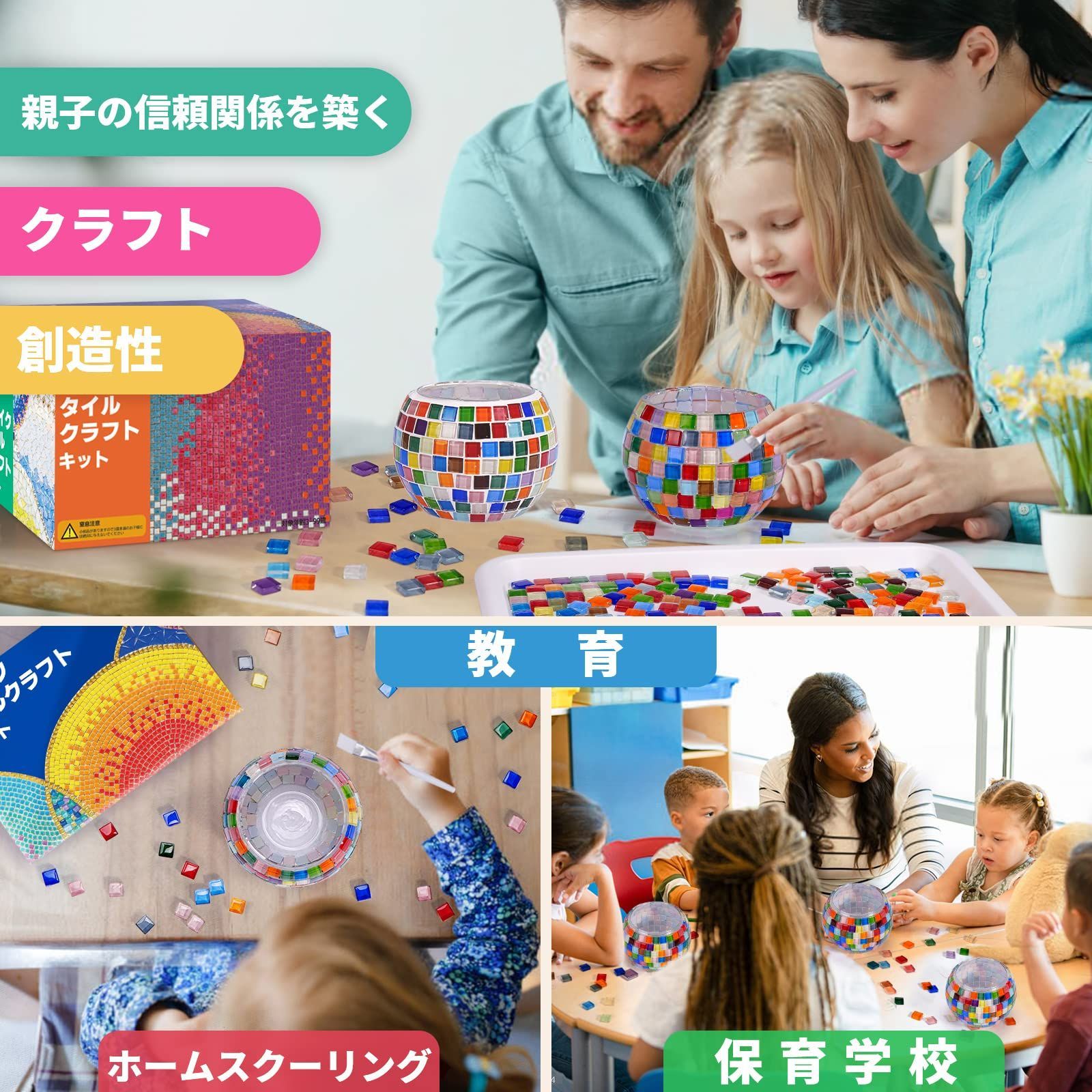 【創造力と想像力を育成する】このモザイクキャンドルホルダー手作りキットはチャレンジ性があるハンドメイドキットです、お子様が作っている間に文句とかあるかもしれませんが、自分が精一杯で作ったモザイクキャンドルホルダーを見た後きっと達成感がかんじます。そしてきっとこのモザイクキャンドルホルダーを大切にします、物を大切にする心も育てます。