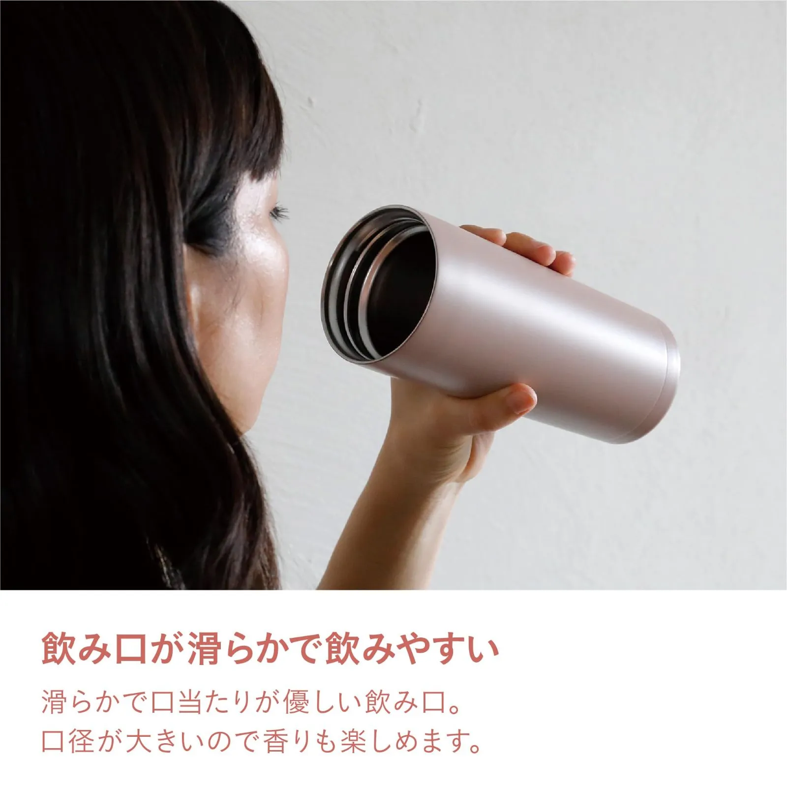 本体は口径(73mm)が広いので飲み物を注ぎやすく、お手入れするときも洗いやすい。パーツも分解できるので清潔にご使用いただけます