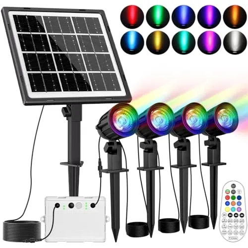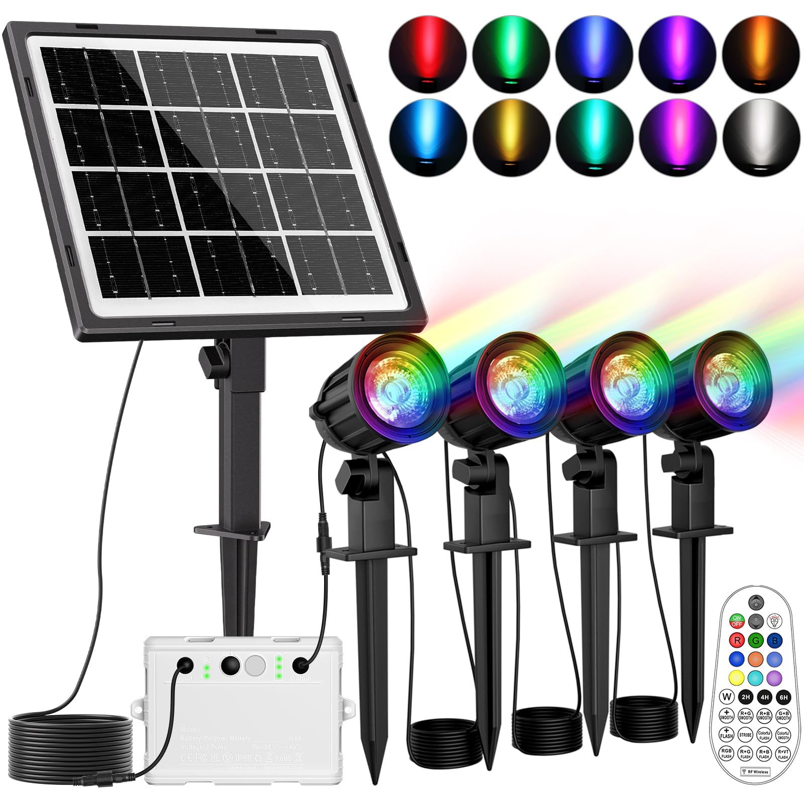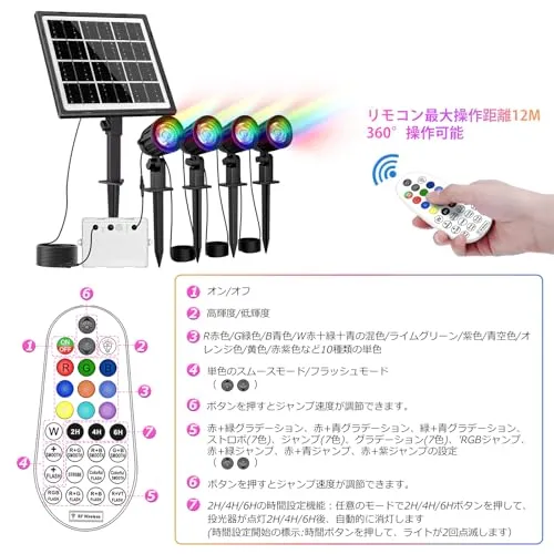 【最新の分離式RGBソーラーガーデンライト電気代不要10色切替&輝度調節】業界初登場の4灯式の分離式RGBソーラーガーデンライトは赤R、緑G、青Bの3原色を利用して、10色を表現することが可能で、さまざまな夜の雰囲気を楽しめます。または点灯パターンも二モード操作(フラッシュ/スムース)あるので、シーンに合わせて選ぶことができます。10色切替可能なので四季に合わせて照明を変えたり用途によって、カラーを自由的に変化できます。または普段照明用の純色照明を調節して、日常の庭の照明用ライトとして利用できます。単色の明るさも簡単に調節できますので、場所や目的に合わせて使えます。さまざまな照明効果を設定できます。分離式ソーラー充電で、日当たりのよい庭でソーラーパネルで充電し、かげになりがちのところの夜間照明できます。ソーラー充電しきて太陽光で充電でき、配線の必要がなく設置に自由が効くこと、それに電気代がかからないです。美しい雰囲気を作り出すの同時に家計を節約できます。