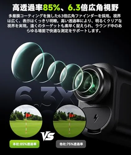 【LCD 黒表示0.02s 測定6.3 倍広角視野高透過率85%】FOSSiBOT F1000 ゴルフ 距離計は、85% 高透過率の LCD ビューファインダーを搭載し、強い光の下でもデータを鮮明に表示し、素早く正確な距離を把握できます。多層膜コーティングの光学レンズと 6.3 倍の拡大倍率を採用し、広い視野とリアルな色彩再現を実現し、遠くの目標を簡単にロックできます。独自の測距技術を活用し、最速 0.02 秒での応答を実現しており、手ブレ補正機能がなくても安定した測定が可能です。さらに視力補正ピント調整リングを搭載し、さまざまなユーザーの視力に適応し、遠距離の目標に正確にピントを合わせることを保証します。