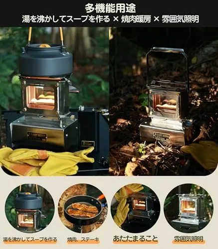 【ポータブル設計 多機能活用】コンパクトサイズ(16.3D12W20.8Hcm)と軽量(約1.85kg)で片手で持ち運び可能,防風構造により野外での安定燃焼を実現。お湯沸かし スープ調理?肉を焼く ステーキ焼きなどの料理から、暖房?照明まで 1 台で全てカバー。炎の鼓動を楽しむ癒しの雰囲気。