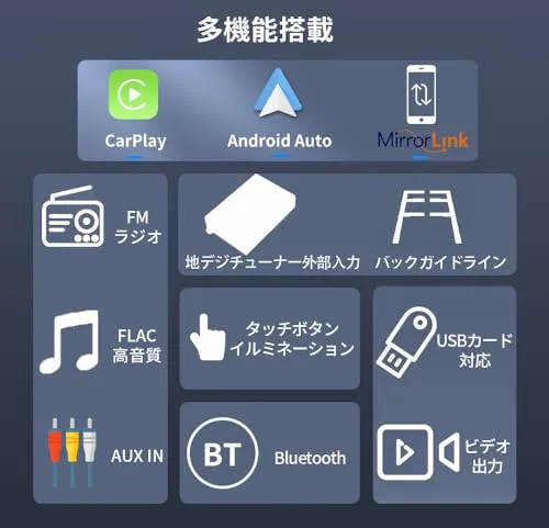 【スマホ画面ミラーリング機能】有線接続して、ミラーリング機能で携帯電話の画面をカーオーディオプレーヤーに投影することもできます。スマホでYoutube、Tver、TikTokなどの動画をオンラインで再生して、ナビの画面で視聴できます。※ミラーリング時一部有料コンテンツの再生できない場合があります。