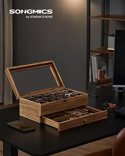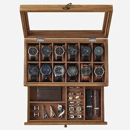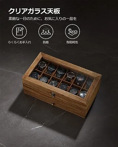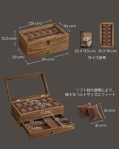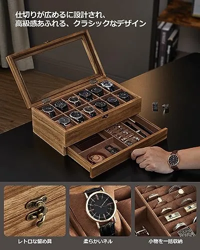 【新品】時計ケース 12本 木製 引き出し付き 腕時計収納 コレクションケース ジュエリー 2段式 透明窓付き ウォッチボックス アクセサリー保管 父の日プレゼント メンズ レディース 誕生日お祝いギフト 木の色 JOW012K01 cff8f112