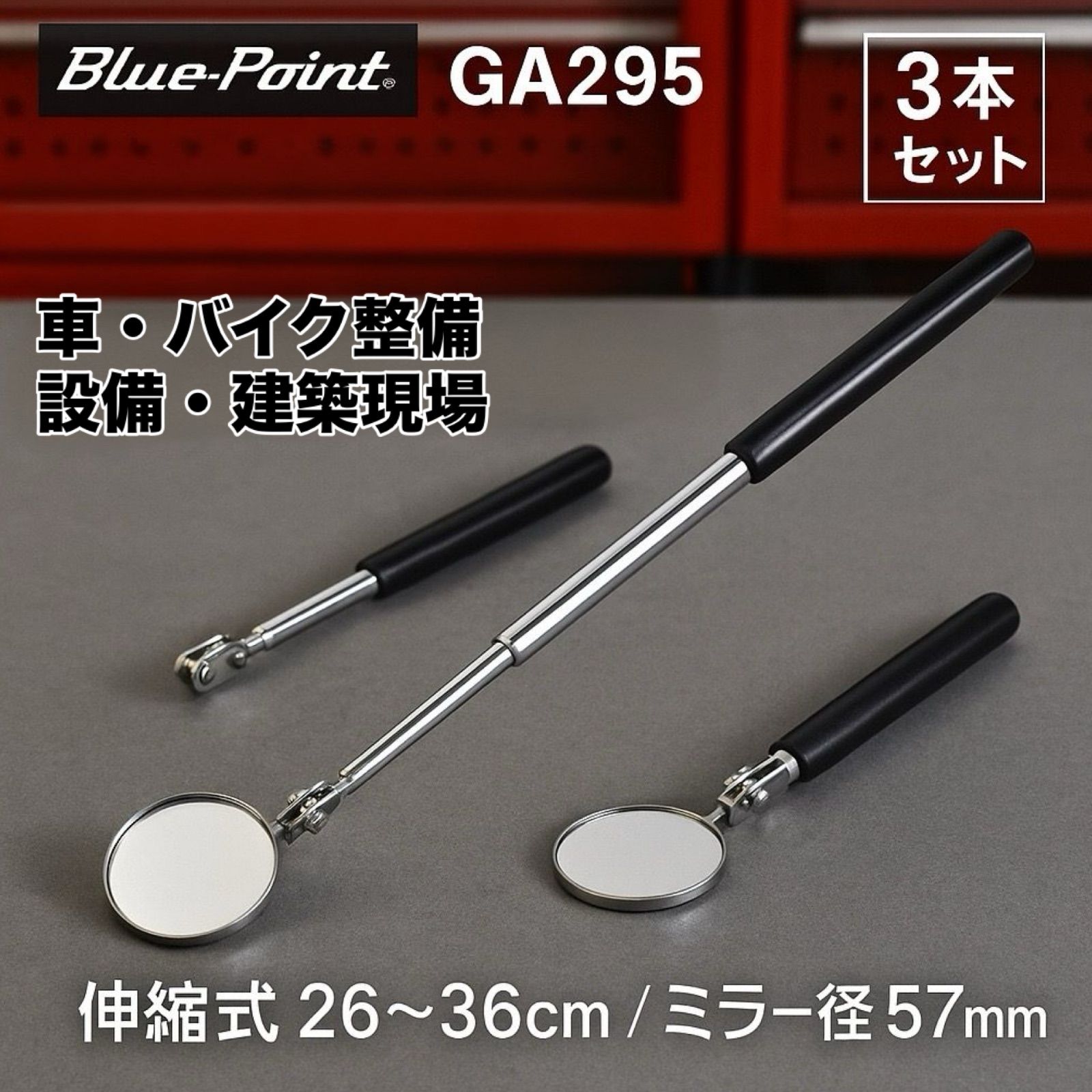 【商品の説明】 Blue-Point(Snap-onグループ)製 GA295 伸縮式インスペクションミラー 3本セットです。 整備士がエンジンルームの奥、車両下、配線裏など 「目視しにくい場所の確認」に使用するプロ用点検ミラーです。