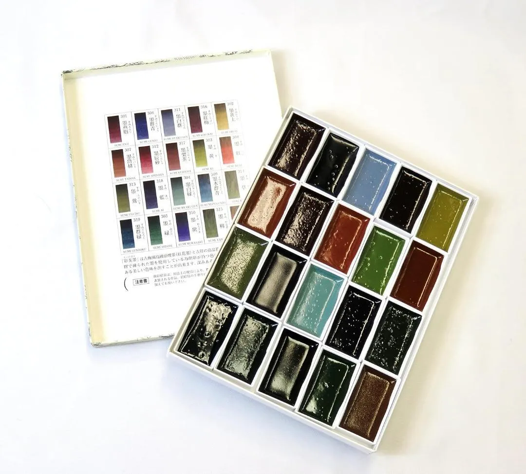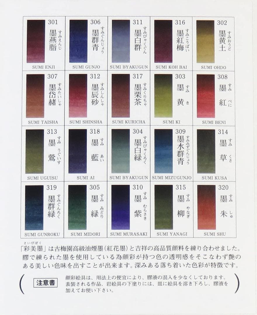 セット内容:302 墨黄土・308 墨紅・314 墨草・320 墨朱・316 墨紅梅・303 墨黄・309 墨水群青・315 墨柳・311 墨白群・317 墨栗茶・304 墨白緑・310 墨紫・306 墨群青・312 墨辰砂・318 墨藍・305 墨緑・301 墨燕脂・307 墨岱赭・313 墨鶯・319 墨群緑