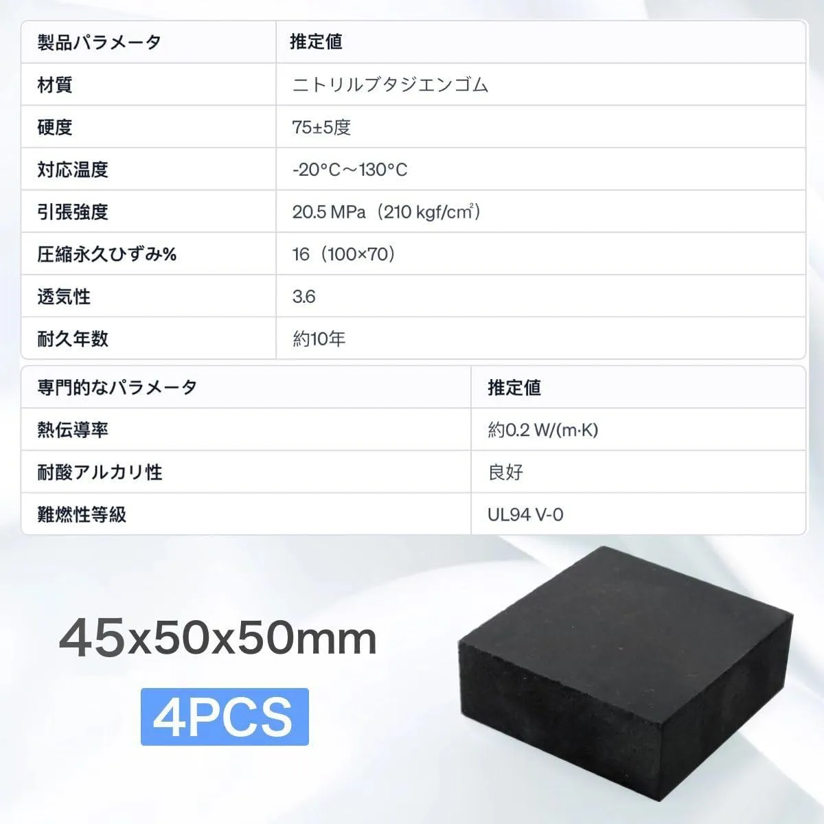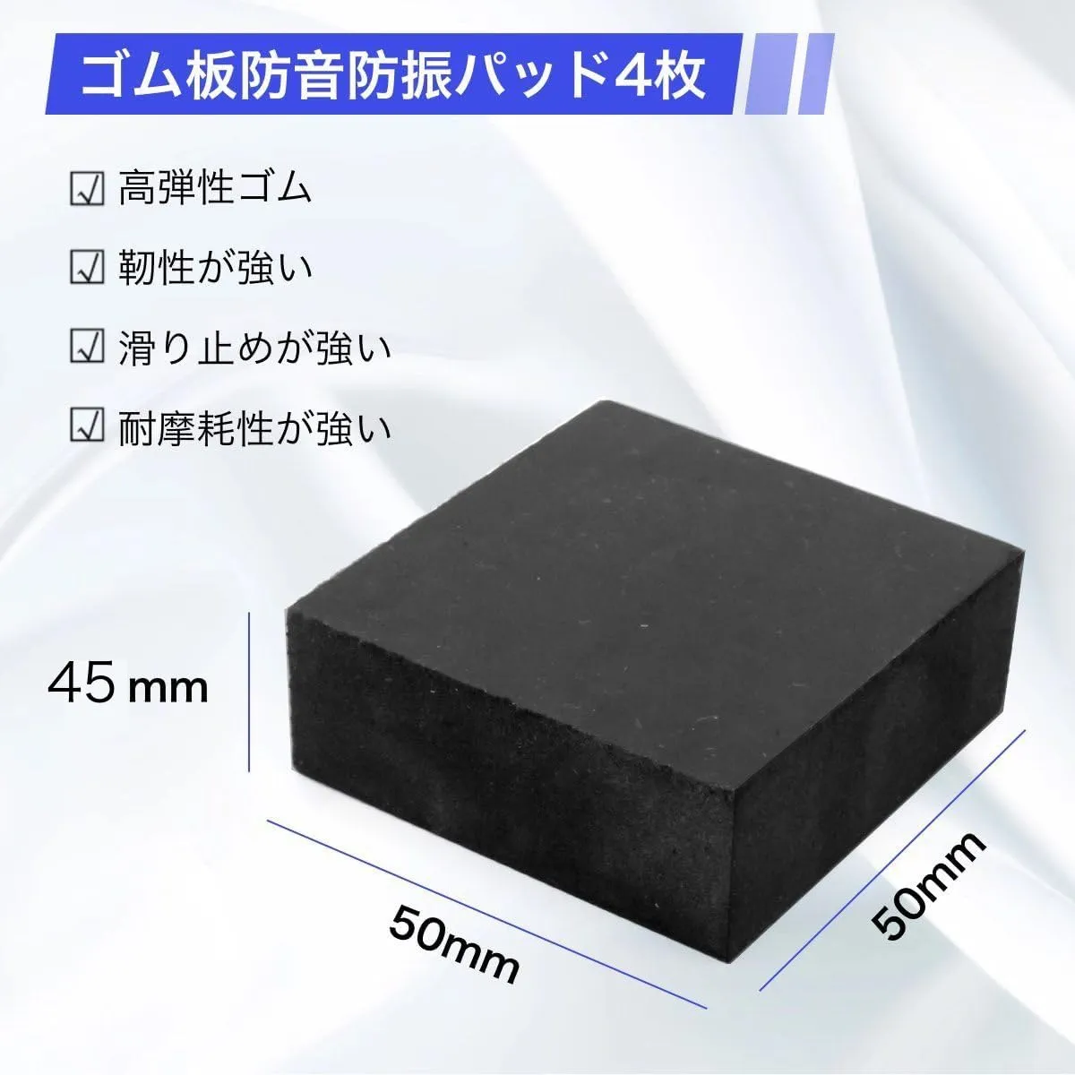 [商品仕様] 4個セットのゴム板。サイズ:50mm x 50mm x 40mm、カラー:ブラック。多用途に対応した便利なアイテムです;