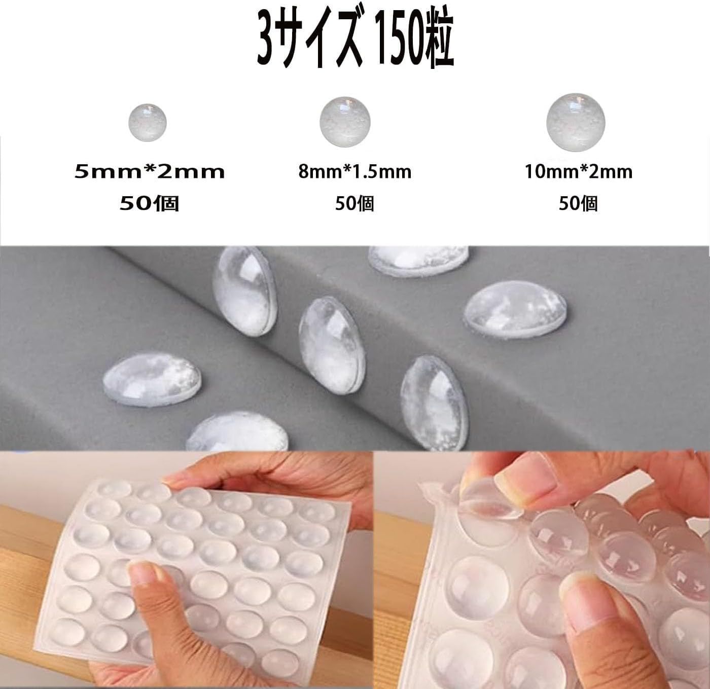 新品 HUIKKJP 戸当たりクッション 150粒 3サイズ 直径5mm/8mm/10mm ゴム足 ゴム クッション 透明 滑り止め 傷防止 衝撃吸収材 半球シリコン 家具 ドア 扉 棚 (丸型,5+8+10mm)