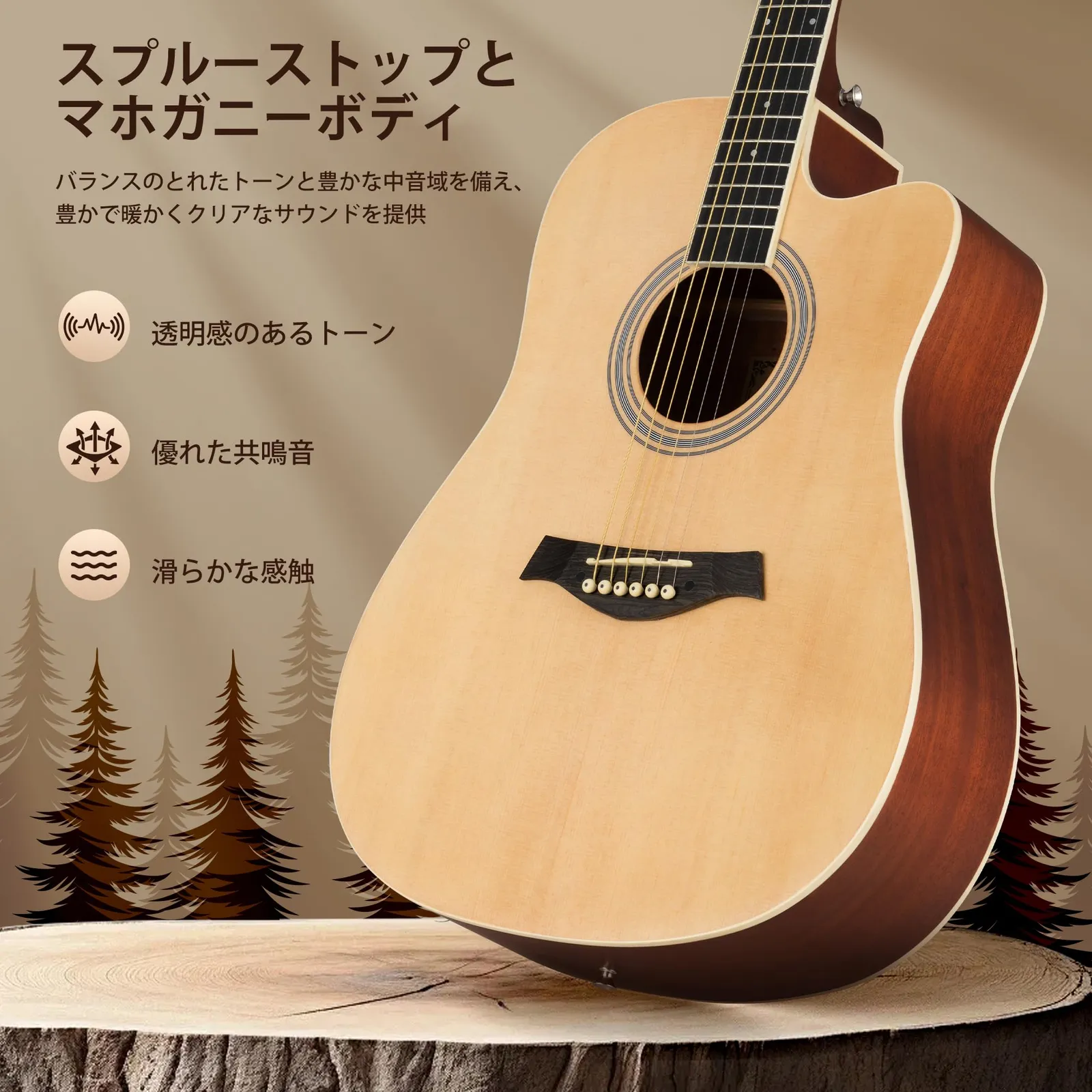 【初心者に最適な設計&即スタートセット】 41インチのフルサイズアコースティックギターは、人間工学に基づいたCシェイプネックで快適な演奏性を実現。初心者でも扱いやすく、両方向調整ロッドによりネック調整も簡単。ギター本体に加え、チューナー・ピック・替え弦・ストラップなど8点付属し、開封後すぐに演奏が始められます。