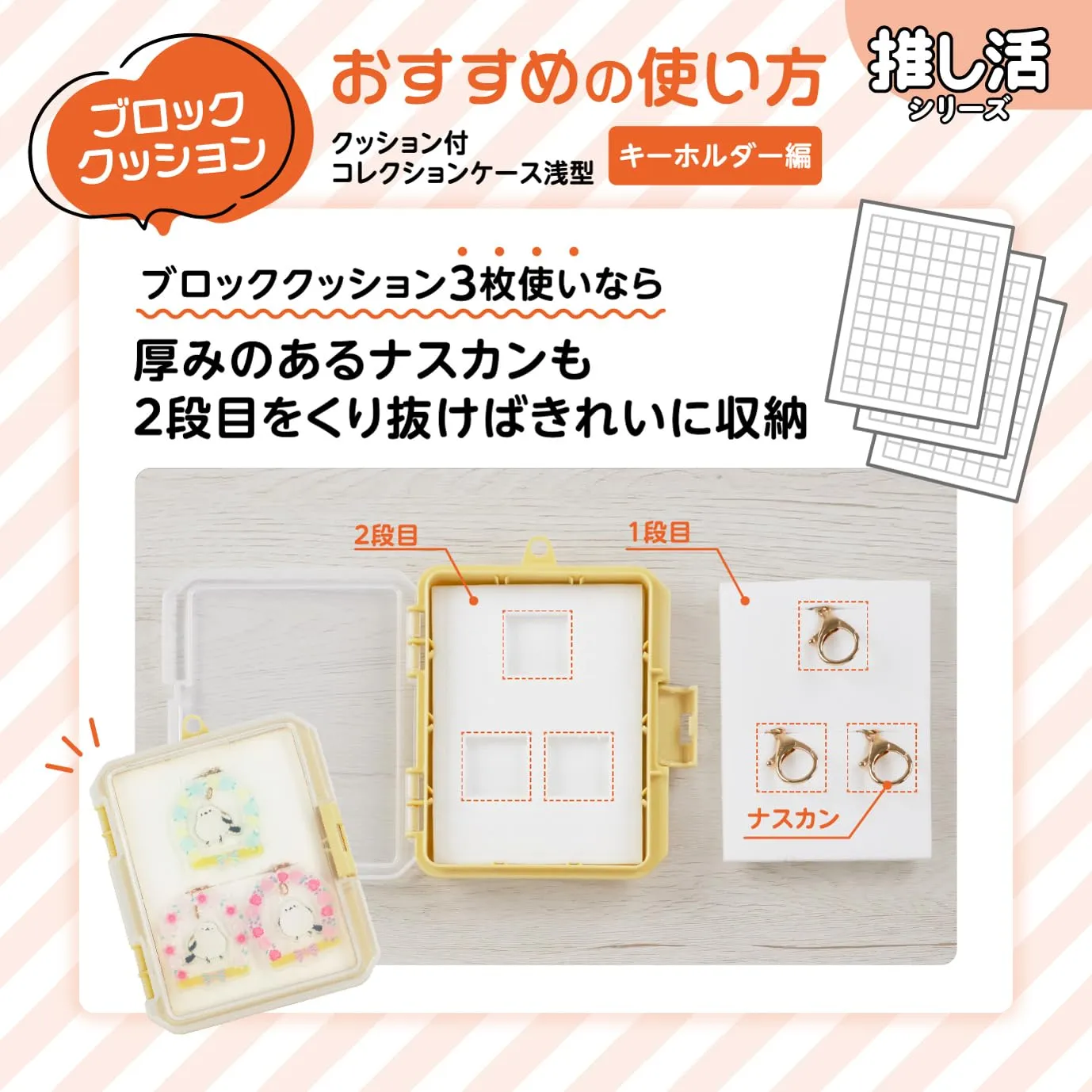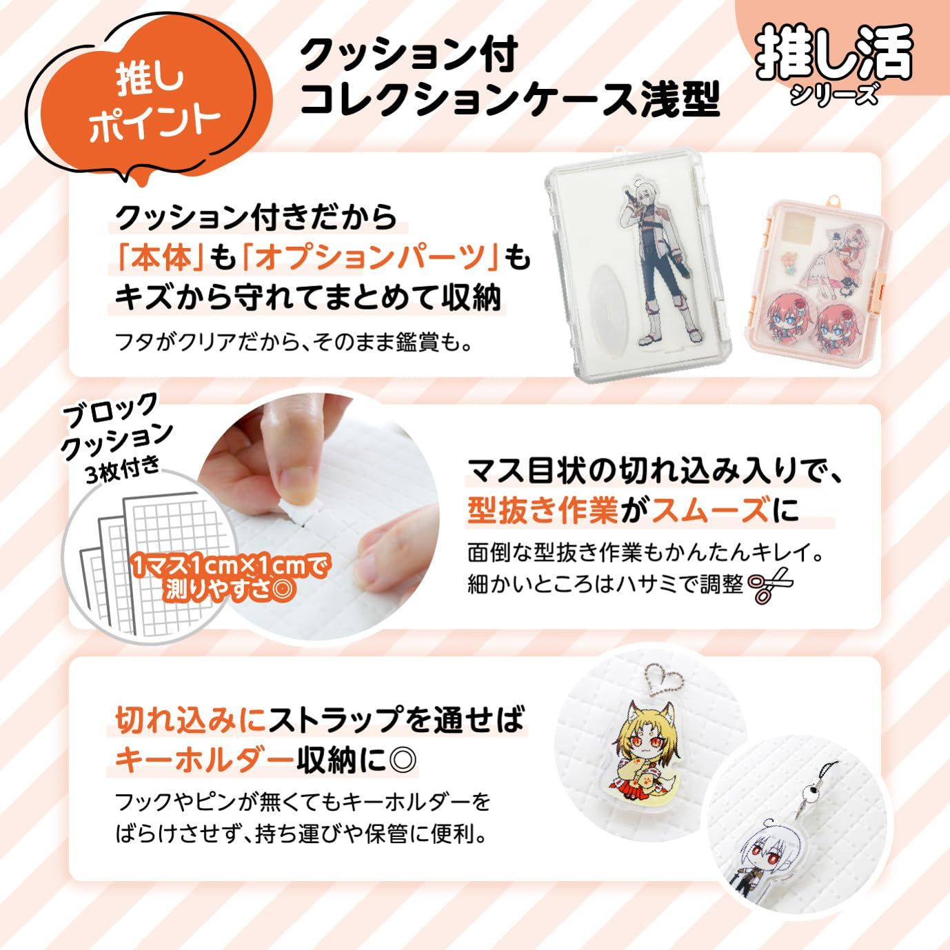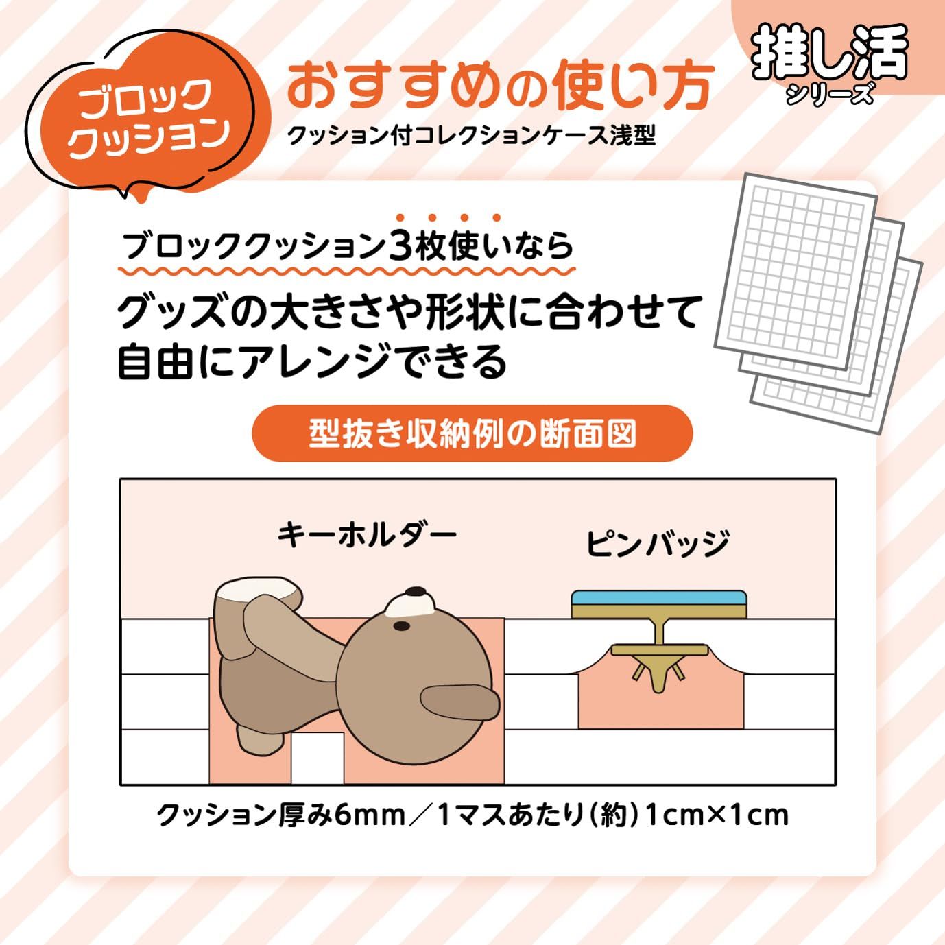 型抜きしやすいブロッククッション3枚付き。高透明な蓋は、中身がよく見えます。ブロッククッションは指で簡単に抜くことができます。缶バッチ、アクリルグッズ、キーホルダーなどの収納に便利です。※持ち歩きには適していません。陳列用のフックを利用してかける収納も可能。