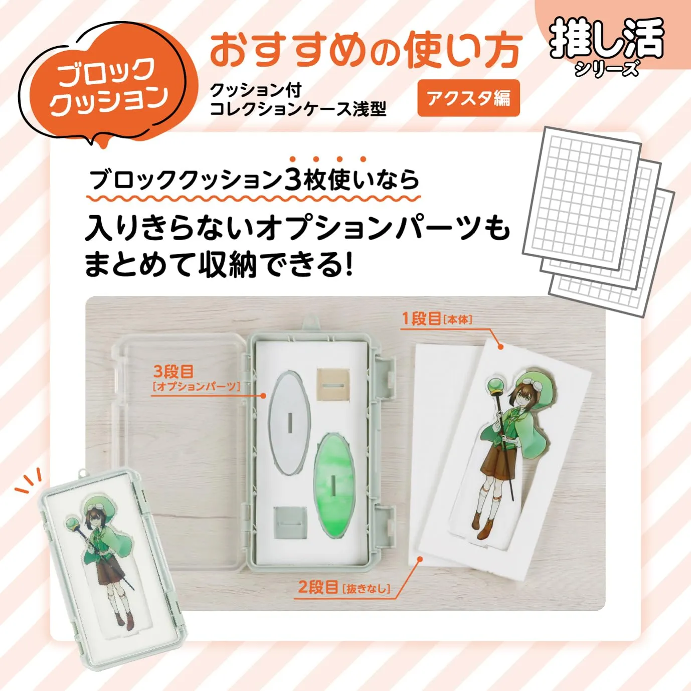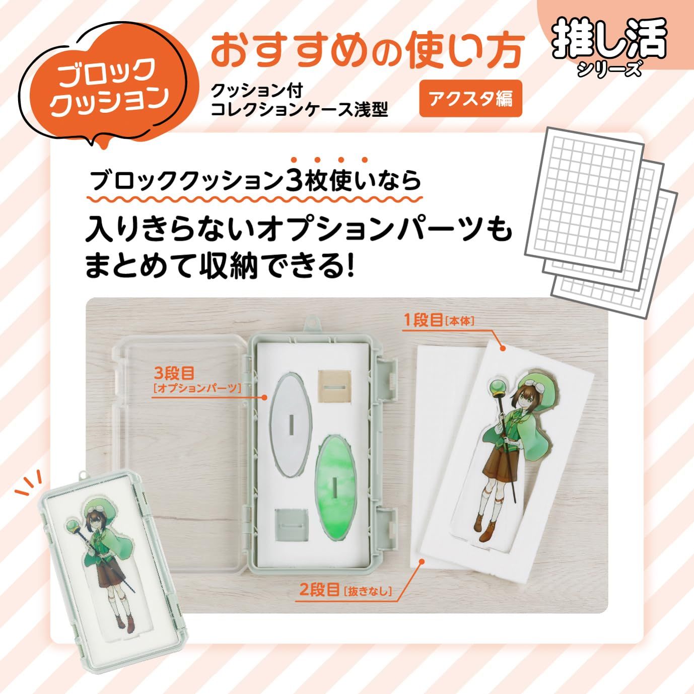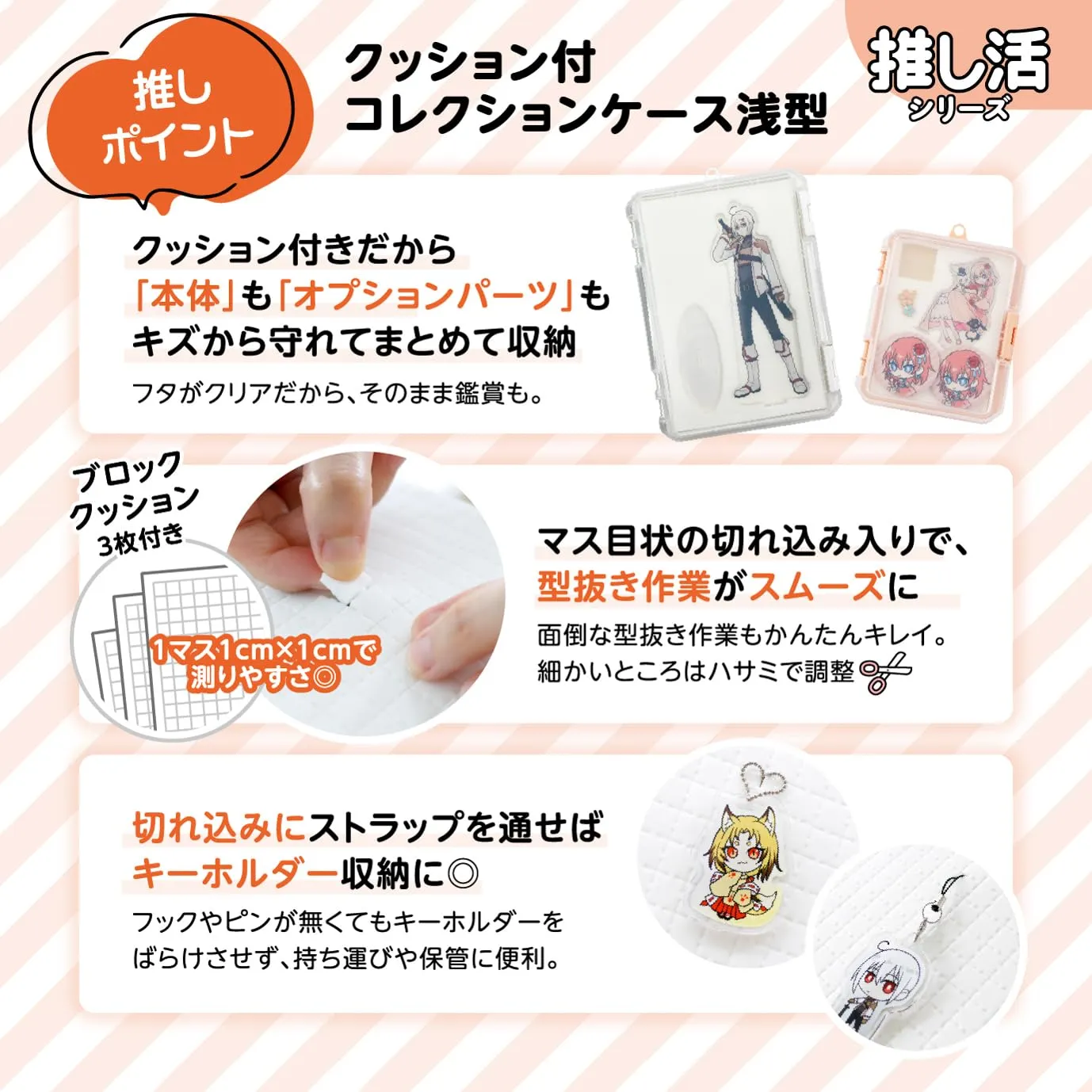 型抜きしやすいブロッククッション3枚付き。高透明な蓋は、中身がよく見えます。ブロッククッションは指で簡単に抜くことができます。缶バッチ、アクリルグッズ、キーホルダーなどの収納に便利です。※持ち歩きには適していません。陳列用のフックを利用してかける収納も可能。