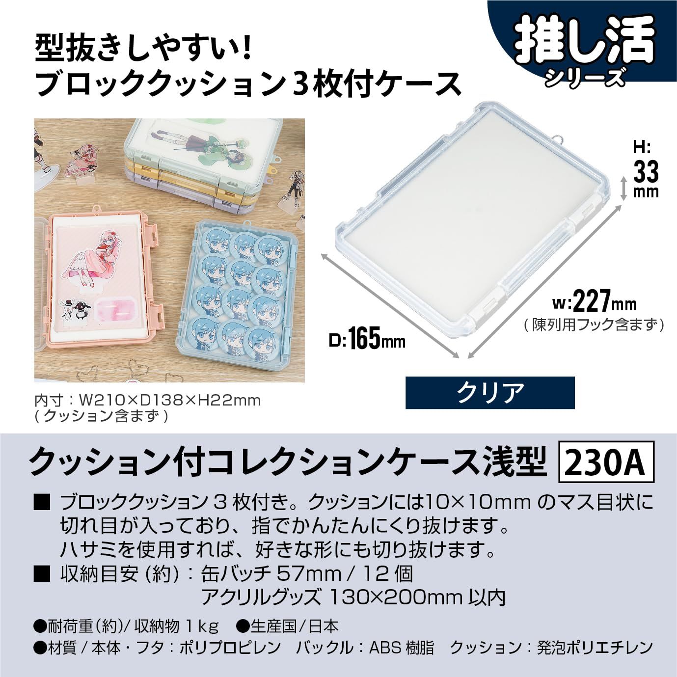 新品 JEJアステージ 推し活 収納ケース クリア クッション付 コレクションケース 浅型 230A 持ち運び 缶バッチ、アクリルグッズ、キーホルダー 収納