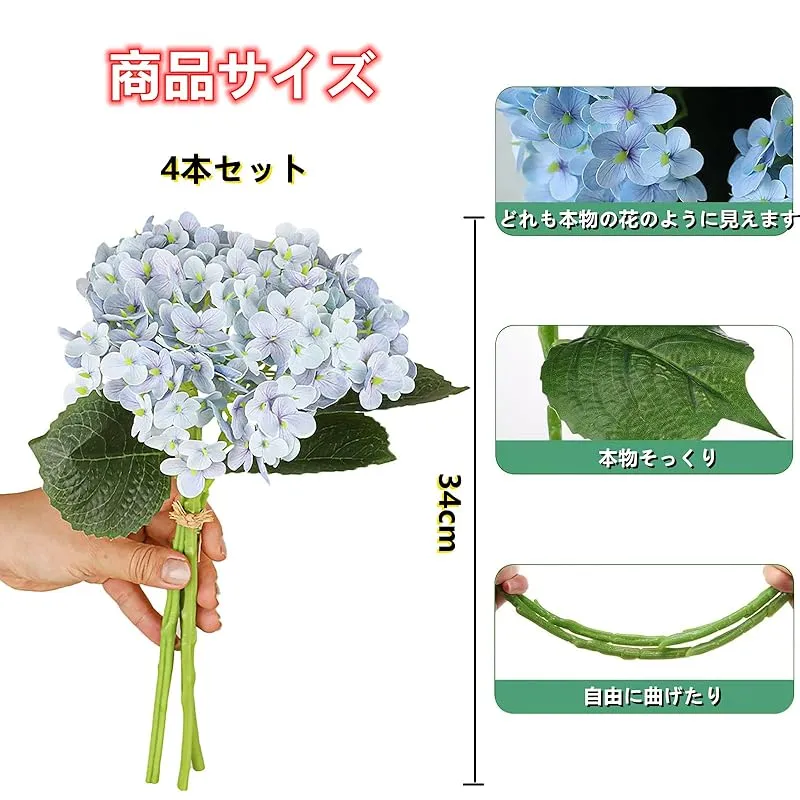 【商品概要】 商品仕様:全長:34cm/本、セット内容:4本セット 本物そっくり:本物のアジサイのような質感で、色褪せず、仕上がりも素晴らしいです。花びらがはがれた小さな花は、どれも本物の花のように見えます。ワイヤーが枝の内側に含まれているため、直立した状態を保ちます。満開、咲き掛け、つぼみと自然な趣です。 アジサイ花言葉:アジサイの花言葉は「強さ」「決意」「不屈」です。結婚式やクリスマスパーティー、誕生日、記念日、母の日、自宅インテリアなどにぴったりのお花ですね。 色あせない:このあじさいの造花は長期間新鮮で美しく持続することができます。家で花を使うのが好きで、花を交換するのにうんざりしているなら、私たちの製品は良い選択でしょう。アジサイの造花は優しくて暖かい雰囲気を盛り上げます。インテリア装飾に大人気です。 幅広い用途:1本でもきれいで、組み合わせてもきれいで、部屋をより美しくするためにそれを飾ってください!綺麗な写真を撮ってSNSに映るもピッタリです!各種イベントや結婚式、ウェディング、パーティーなどで写真撮影に適用です。お部屋やリビング、喫茶店などで素晴らしいなディスプレイとしてオススメします。花瓶にさしてインテリアとしてはもちろん、アクセサリー、ウェディング用の花冠やブーケ、リース作成用の素材にも最適です。