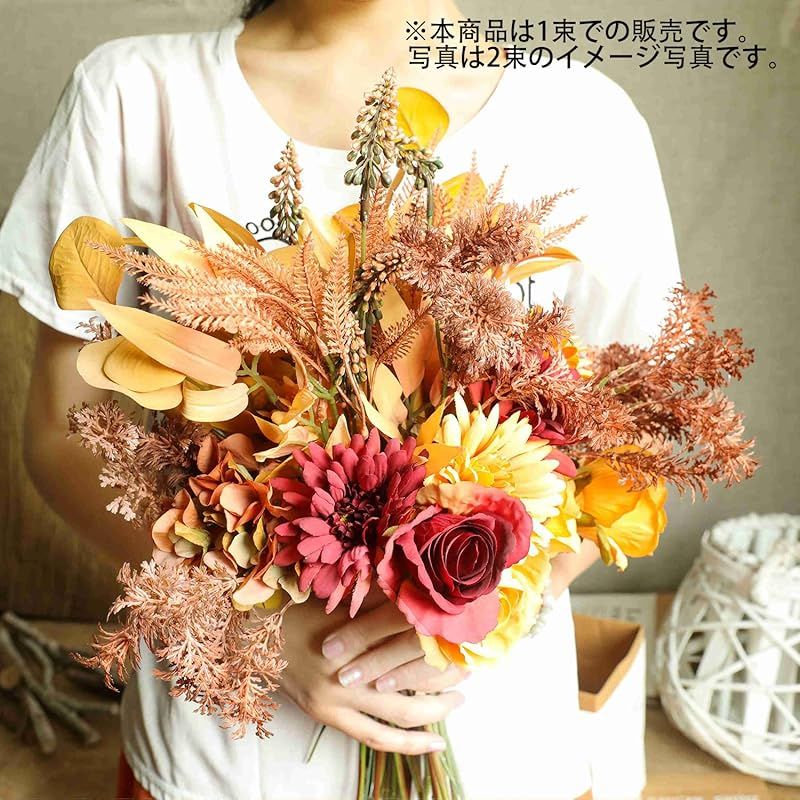 【商品概要】 ?結婚式、卒業式、春、秋のイベント等のディスプレイ・店舗装飾用に、番組やコスプレなどの撮影用や舞台の小道具にもお使いいただけます。 ?シルクフラワーなので美しいまま長期間飾ることができ、世話、水遣りも不要で、季節を問わず翌年以降もお使いいただけます。 ?サイズ:長さ約44cm。花材:2本xバラ、2本x菊、1本xあじさい、そのほか。写真は2束のイメージ写真です。※本商品は1束での販売です。(2束の場合は数量2にしてください。) ?ご注意:このドライフラワーは梱包の際に、茎や葉を曲げてお入れる場合がございますが、ご了承ください。届きましたら、早めに箱から出して、形を備えてから飾ってください。 ?アフターサービス:本商品をご利用時に質問があれば、弊店までお気軽にお問い合わせください。連絡方法:[アカウントサービス]-[注文履歴]-[出品者に連絡する]。