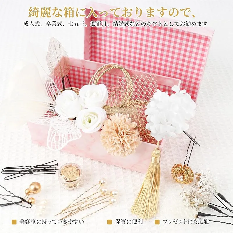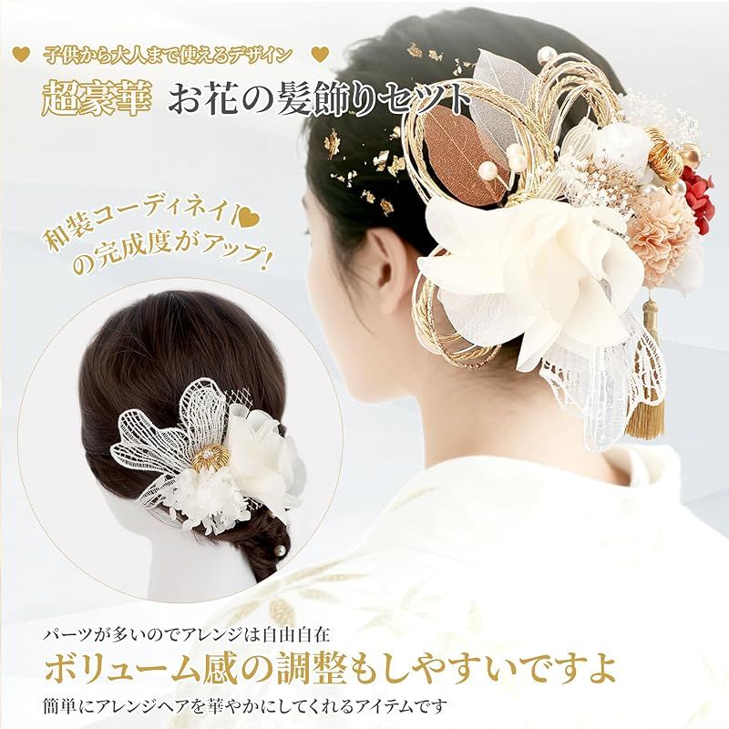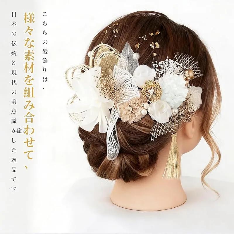 【高級感のある髪飾り】セット内容:タッセル、白いバラ、金箔、ピンポンマム、紫陽花、網型シム、サテンフラワー、かすみ草、リーフ、パールピン、アンティークベリー、水引、水引玉、レースピン。セット内容は5枚目の画像をご参照ください。繊細な花びらの大輪の花に煌めく水引やタッセルが添えられた華やかなデザインです。