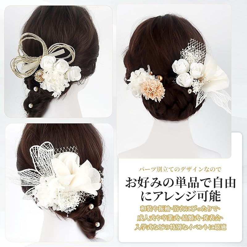 【自由なアレンジ】さまざまなスタイルの組み合わせが、個性的な美しさを引き立てます。成人式、卒業式のお振袖、袴等の和装髪飾りです。ご使用時に量を加減できます。両サイドに分けたり全体に散らしたり様々な髪飾りアレンジをお楽しみいただけます。ハーフアップにしてサイドにさしたり、ゆるい編み込みなどのスタイルにもお使いいただけます。またお着物や浴衣の髪飾りとしても素敵です。お好きな単品のみでもお手元にある他のアクセサリーと一緒に使うのも様々なアレンジが楽しめます。