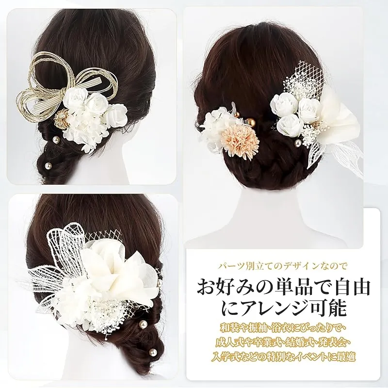 【多様なシーンで活躍】成人式、結婚式、披露宴、ブライダルはもちろん、花火大会、夏祭り、卒業式、お正月、七五三など様々なイベントにもピッタリです。厳選したお花を使用した髪飾りをお届けします。