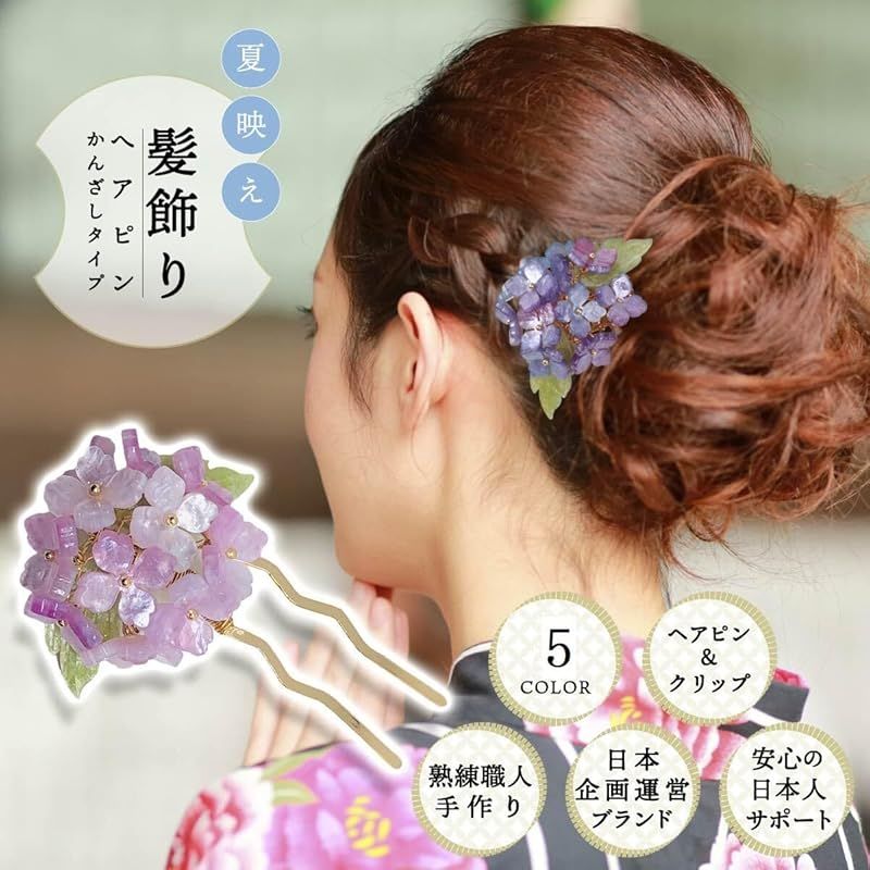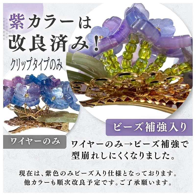 【クリップタイプとかんざしタイプ(ヘアピン)】クリップタイプとかんざしタイプの2タイプがあるため、髪の長さやヘアスタイルによって使いわけることができます。特にショートヘアの方でも使いやすいクリップタイプは便利です。パープル(クリップ)とペールブルー(クリップ・かんざし)タイプは、改良版になっています。他カラーも順次改良予定でございます。カラーによって、作りに違いがありますことご了承願います。