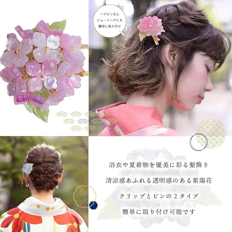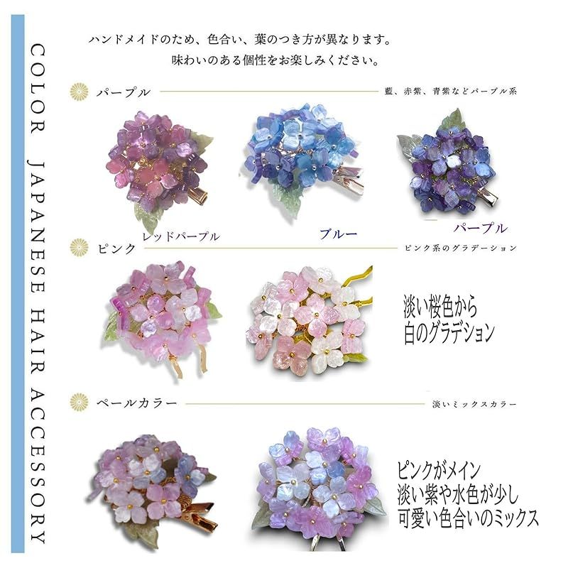 【商品説明】 夏の和装スタイルにワンポイントの華を添えて、あじさいモチーフの髪飾りです。パープル・ブルー・ピンク・レッドパープル・ペールカラー。濃淡のグラデーションが綺麗です。クリップタイプとかんざしタイプがありますので、髪型に合わせてお使いいただけます。浴衣に合わせて涼やかな紫陽花の髪飾りをお楽しみくださいね。