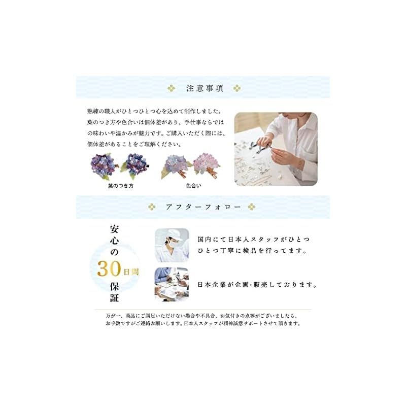 【サイズ】かんざしタイプ(ヘアピン):約9cm×約6cm クリップ約6cm×約6cm (クリップ金具約4.5cm) 紫陽花の厚み約2.5cm 熟練の職人さんによる手作りです。そのため葉の付き方など、作る方により多少付き方などの違いがあります。ご理解願います。
