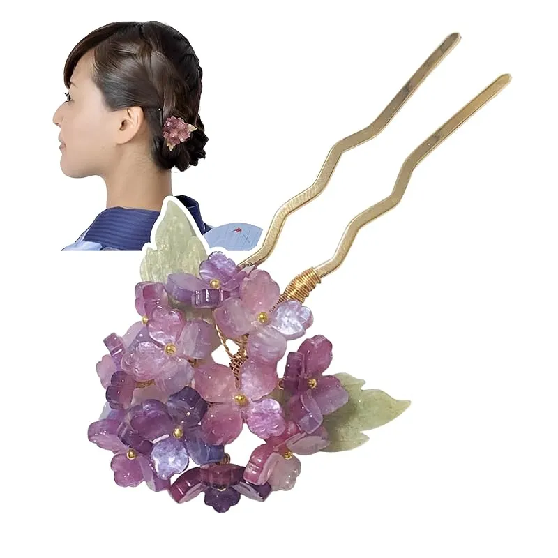 【夏の和装スタイルにワンポイントの華を添えて】夏の風物詩の紫陽花をモチーフとした髪飾り。清涼感のあるアクセサリーとして、浴衣や和装のアクセントとしてお勧めです。季節感のある髪飾りで和装の着こなしをより一層ひきたてることができます。