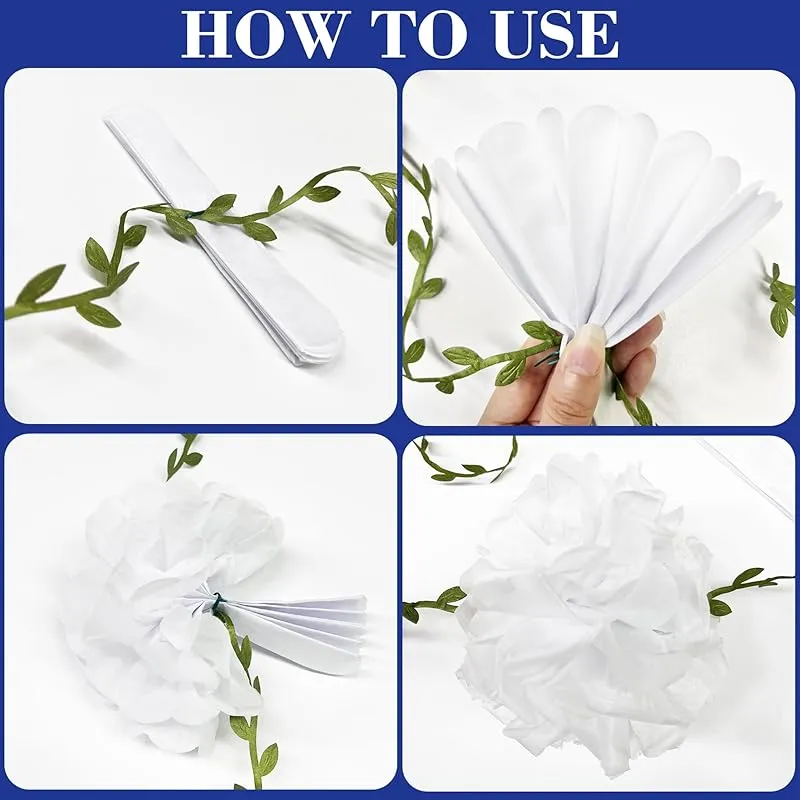 【暖かいヒント】それぞれのティッシュ ペーパーの花は平らに包装されているので、広げて形を整えるだけで、ふんわりさせて吊るすだけです。セットアップは簡単ですが、少し時間がかかります。この楽しいプロジェクトには約 15 分を予定してください。楽しいクラフト作りを!