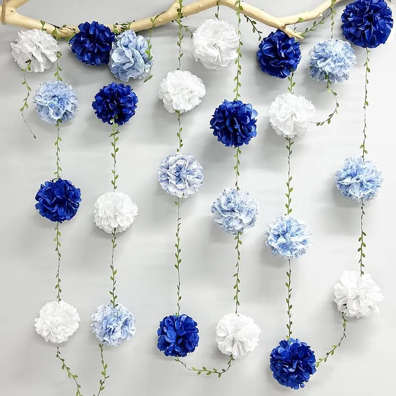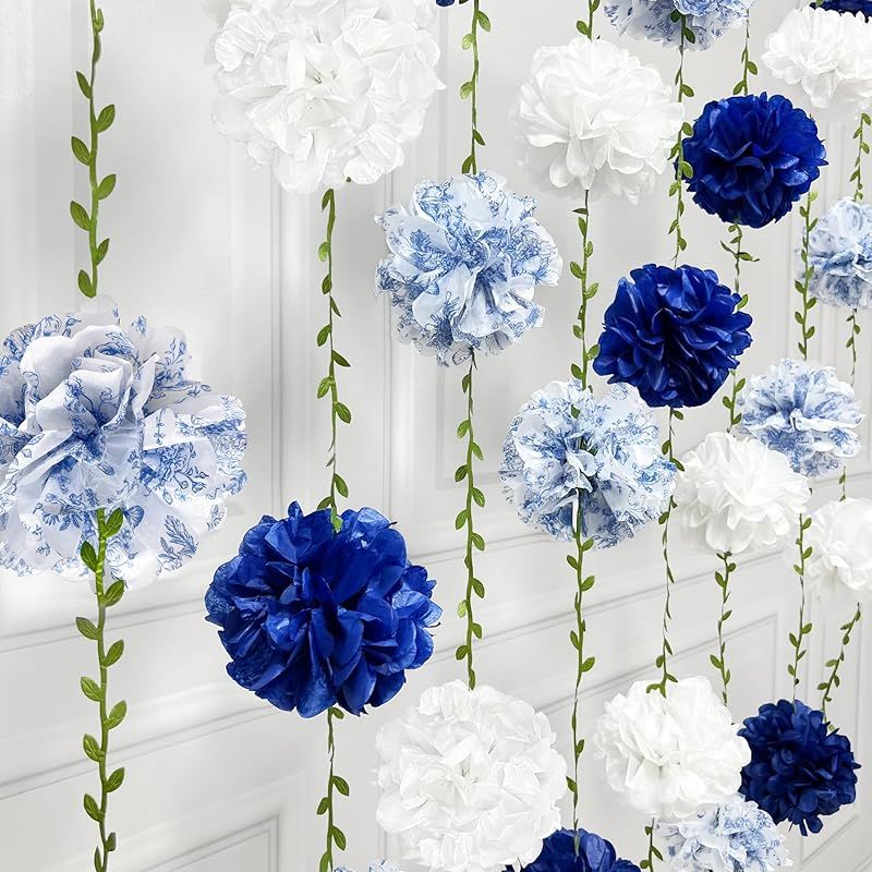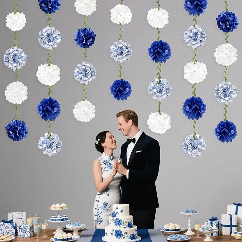 【使用場合】この誕生日、ベビーシャワー、結婚式、ブルーパーティー、シノワズリをテーマにした、茶会、独身パーティー、ブライダルシャワー、バレンタインデー、婚約パーティー、記念日パーティーなど、青と白の花柄をテーマに花紙ポンポンストリーマーしたデコレーションに最適です。また、木、壁、フェンス、天井に吊るして、保育園、自宅、教室、オフィスの装飾にも最適です。