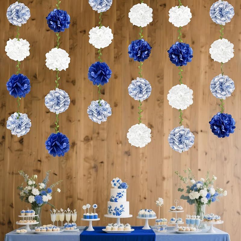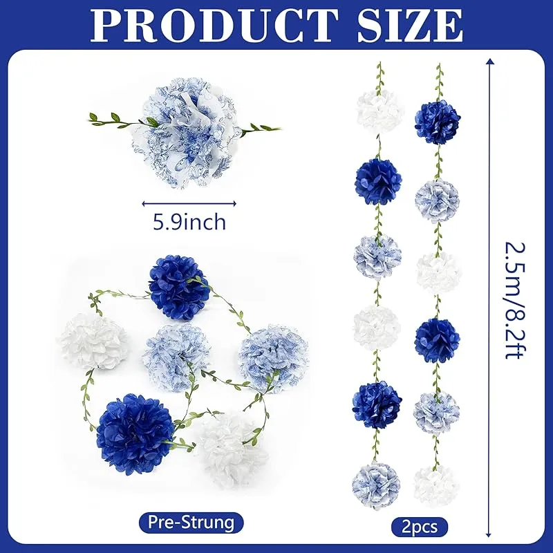 【商品情報】2本青と白の花柄のティッシュポンポンリーフガーランドバナー。各ストリングの長さは2.5M/8.2フィー、ティッシュフラワー6個付き。合計5M/16.4フィート、ティッシュフラワー12個付き。日常の様々なニーズに対応します。