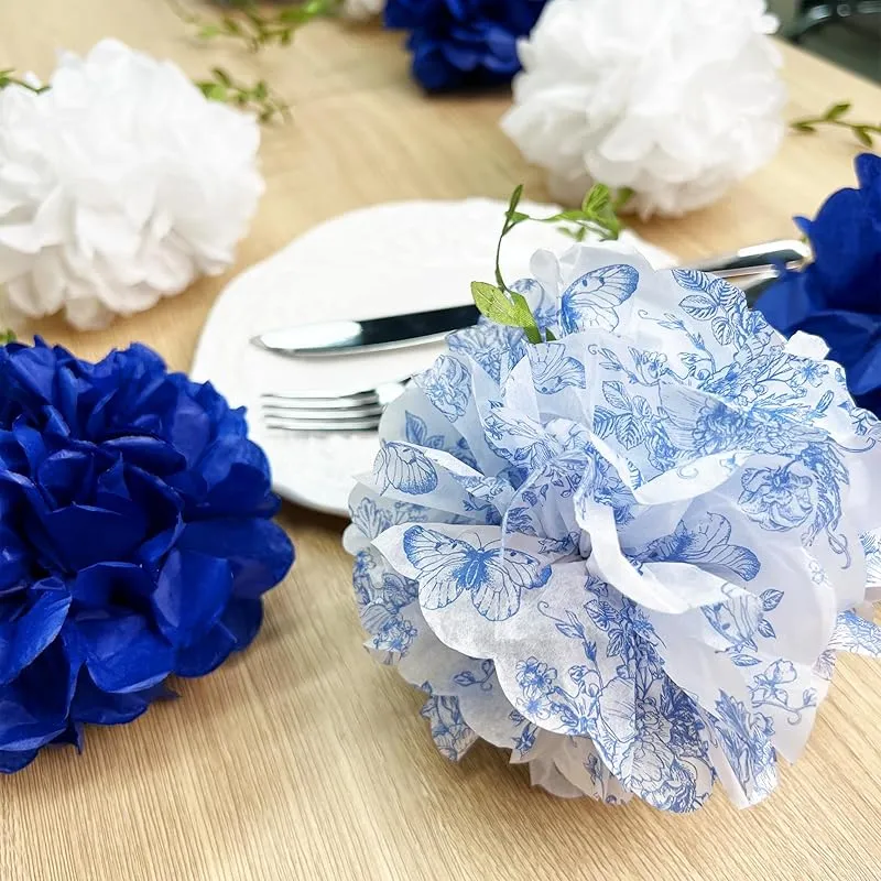 【ユニークなデザイン】ロイヤルブルー、ホワイトとブルーホワイトフローラルのキュートで繊細なさめのティッシュポンポン。花のポンポン1個の直径は15cm/5.9インチ。ビデオや写真の魅力的な背景になります。天井からテープで吊るすこともできます。